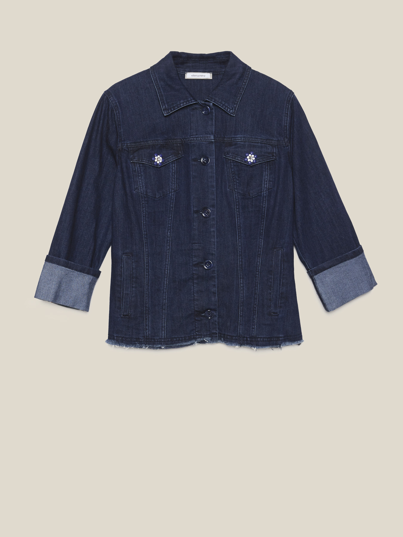 Jeansjacke, blu-rinse Waschung, mit knopfförmiger Perlenstickerei auf den Patten der Taschen; Gleichfarbige Steppnähte und ausgefranster Saum; Umschlag am Ärmelende mit Applikation aus bunt gestreiftem Band