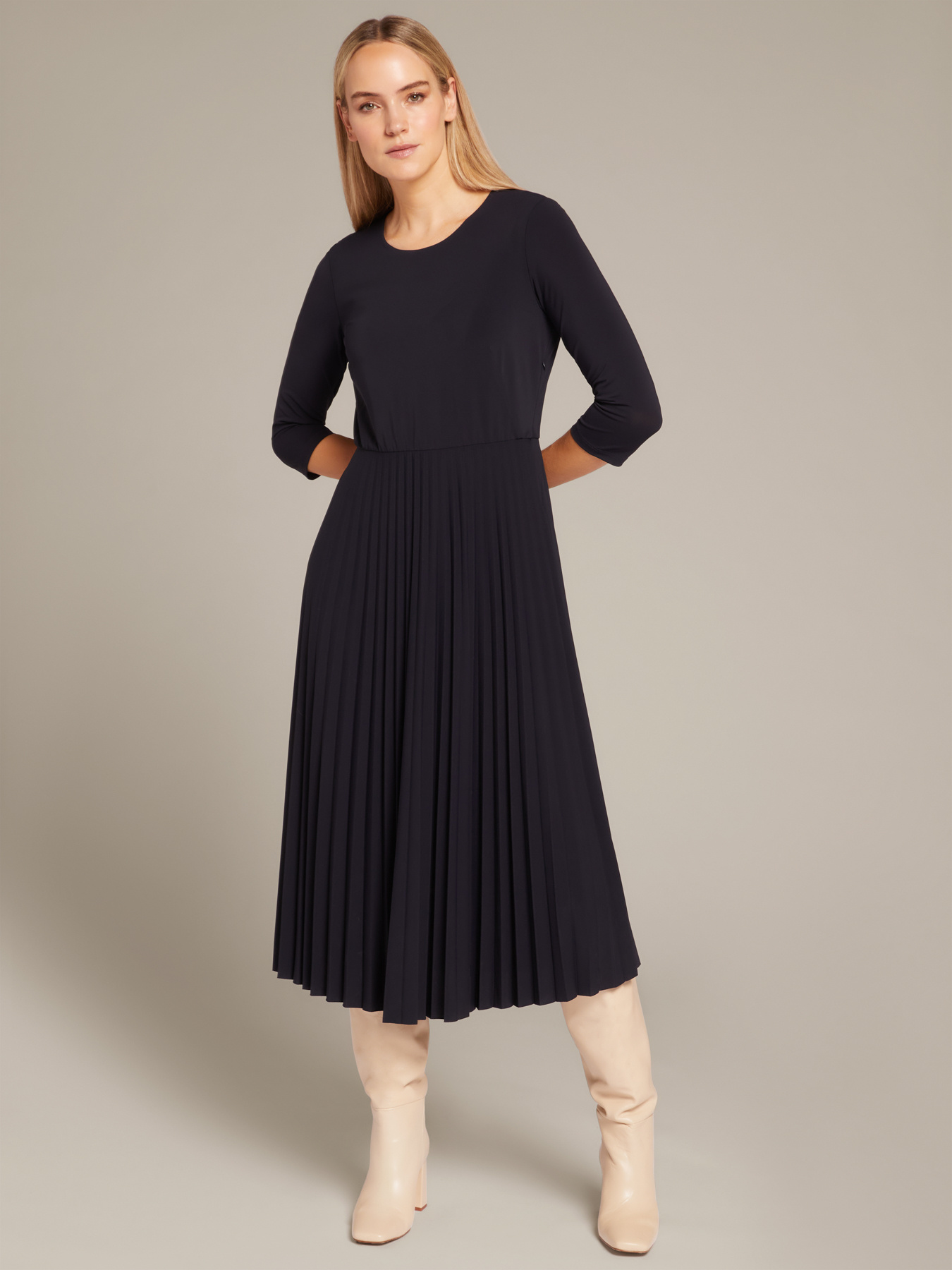 - Jersey-Kleid mit Rundhalsausschnitt, Dreiviertelärmeln und Plisseerock in Midi-Länge
