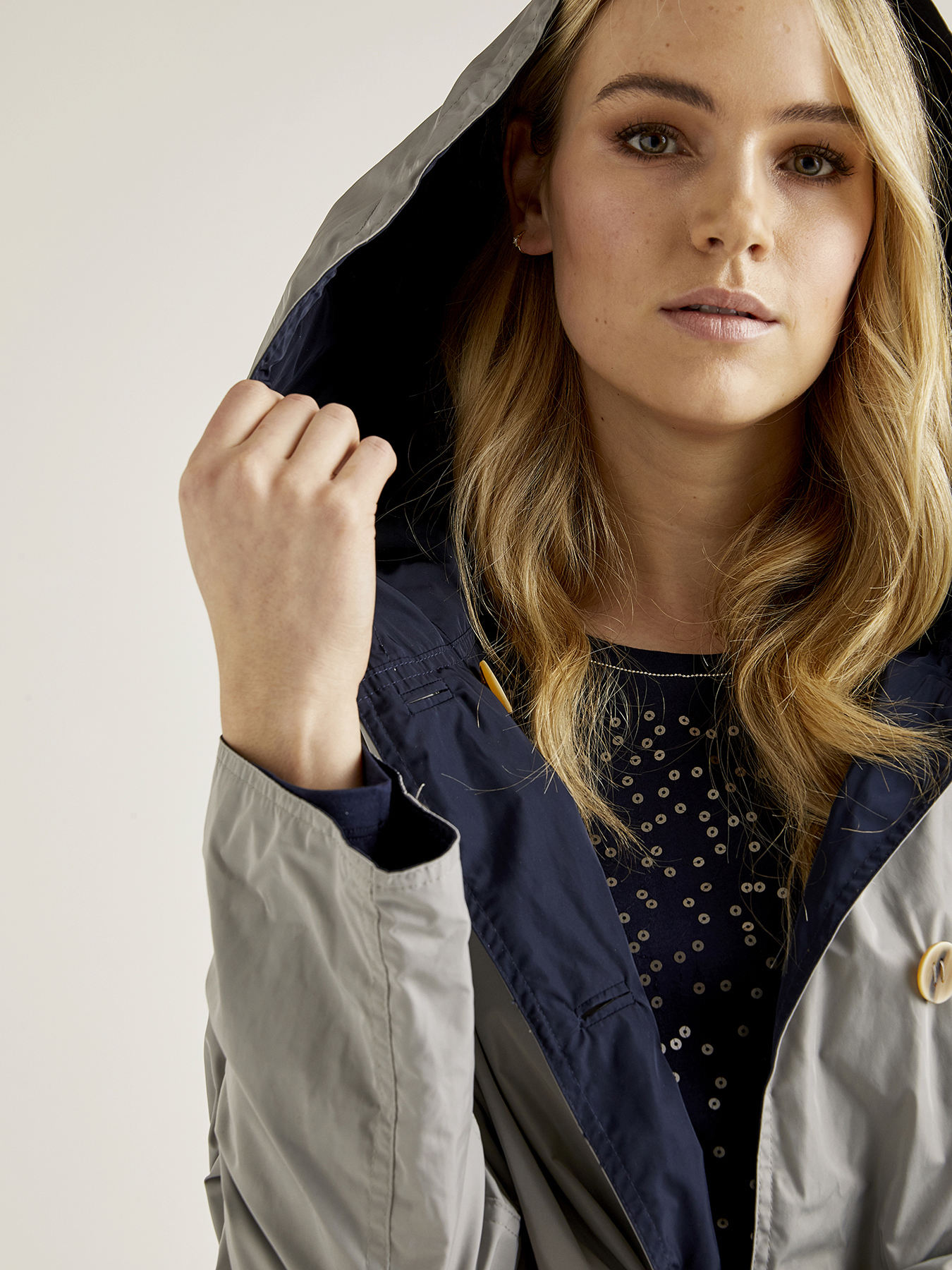 Long, two-tone reversible jacket; drawstring hood and buttons for fastening; two pockets