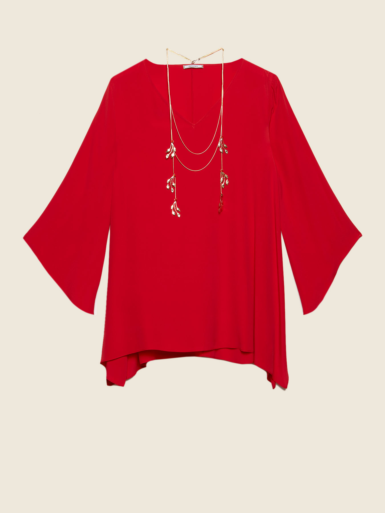 Blusa in tessuto misto seta ; collana lunga allegata al capo, staccabile, con ciondoli a foglia e cristalli; scollo a V; linea svasata ampia e maniche con spacchi.