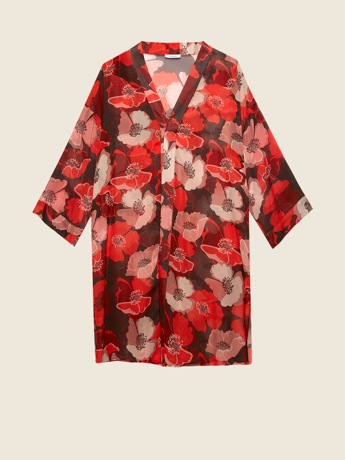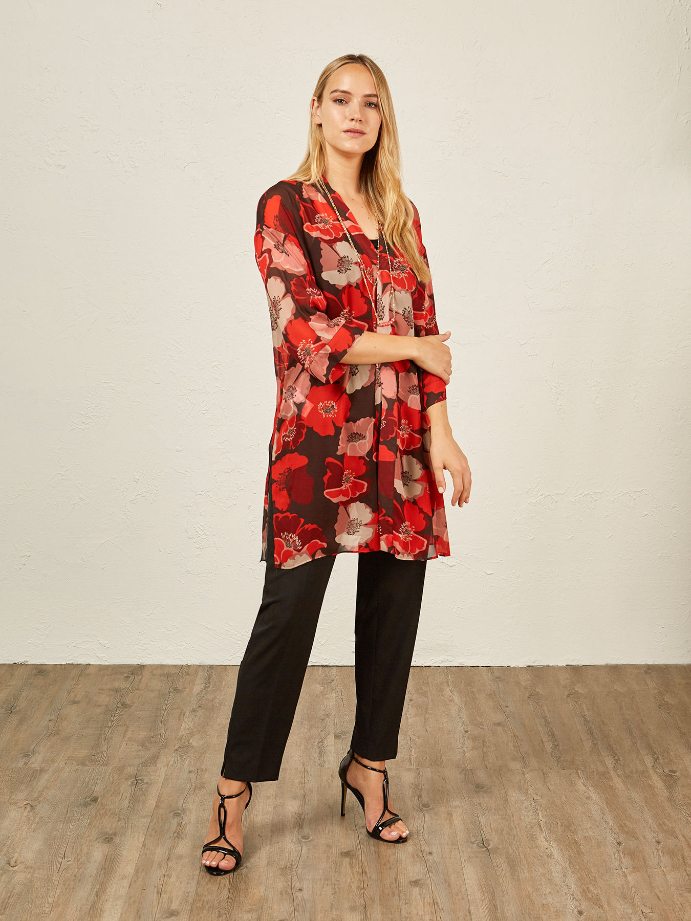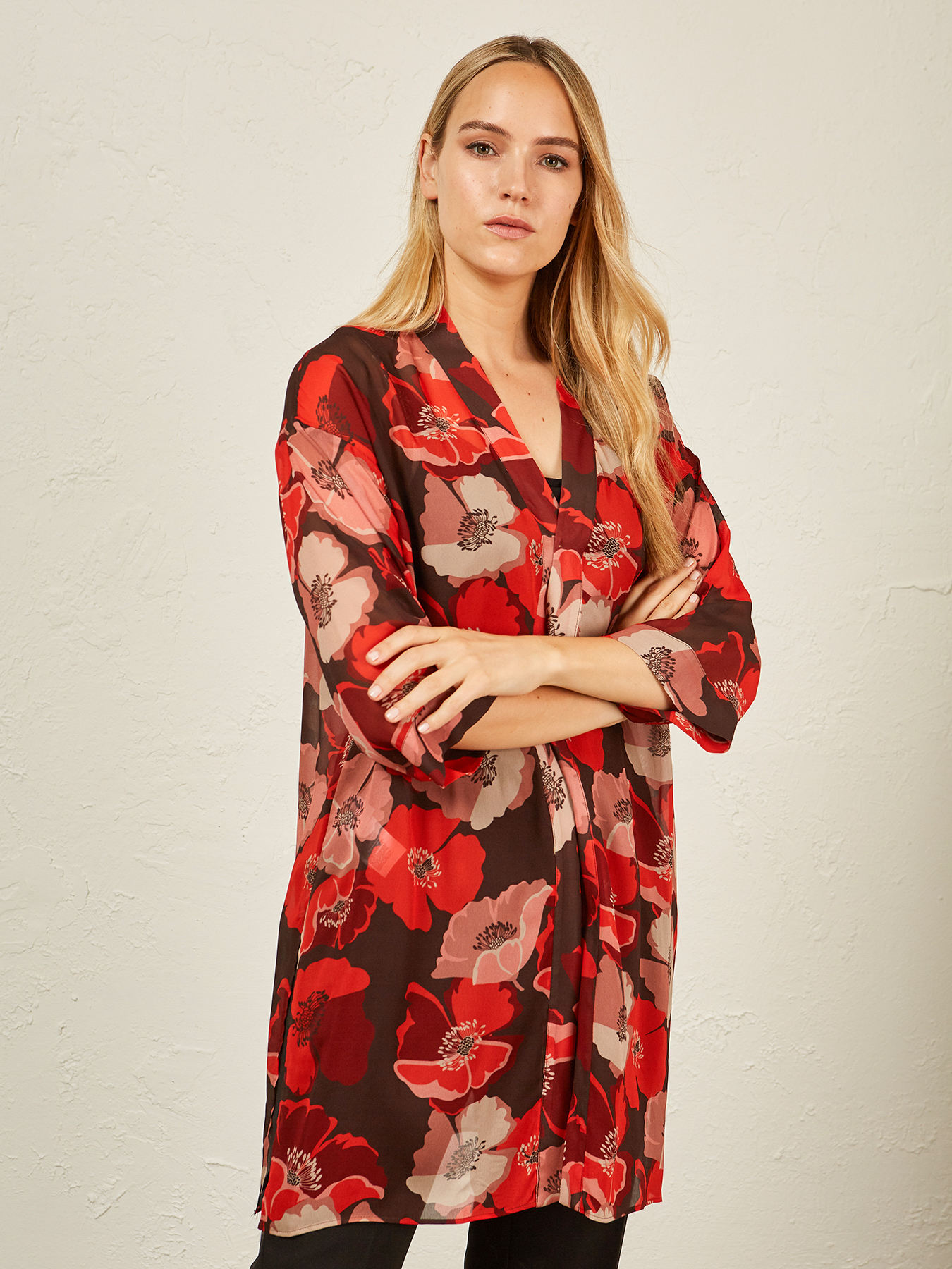 Tunica dalla stampa floreale aperta davanti; linea dritta; maniche lunghe; lunghezza sopra al ginocchio.