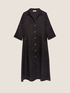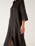 Abito chemisier in puro lino, dalla linea leggermente svasata; colletto, con abbottonatura a vista, motivo di pattina con tasche inserite sui fianchi; dietro con motivo di carrè sollevato effetto trench; maniche a tre quarti risvoltabili, con linguette e bottone.
