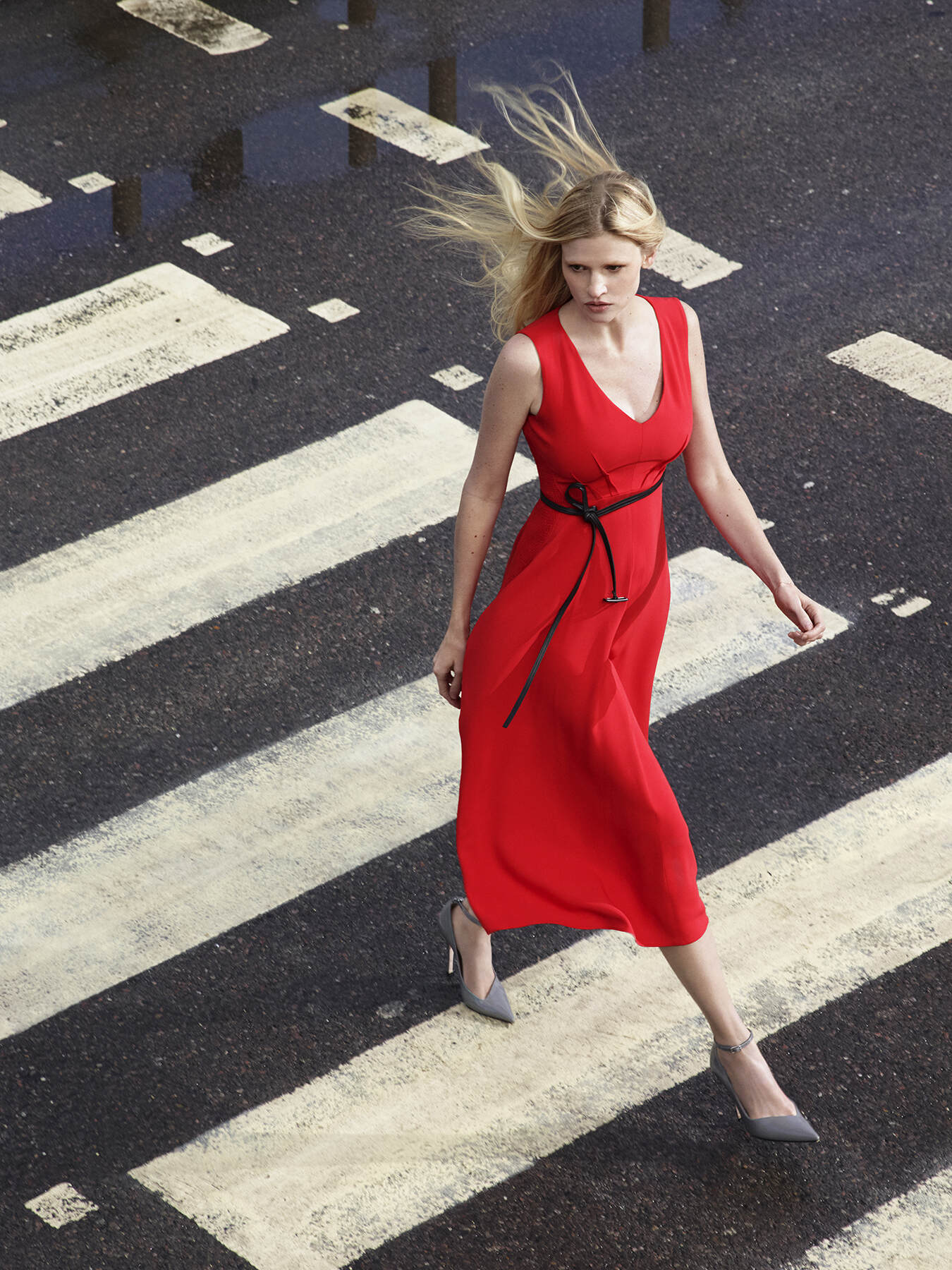 Abito sbracciato in cady stretch dalla linea svasata a quattro teli; inserto a losanga sui fianchi con ricamo "punto smock" elasticizzato; scollo a "V"; creazione di Alessandro Dell'Acqua per Elena Miro', modello "Madison".