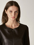 Abito in Punto Milano compatto con davanti in tessuto "fake leather"; linea diritta, scollo tondo con apertura zip sul davanti, tasche a scomparsa inserite nei fianchi; tagli "leather effect", manica lunga.
