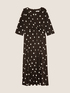Abito senza maniche in jersey stampato a pois; scollo a V che incrocia davanti e zip dietro; sfoderato; custodia in organza con maniche pretagliate, da cucire al capo a piacere.