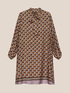Abito in marocaine dalla stampa geometrica piazzata, linea morbida ; fusciacca che annoda sul collo, manica leggermente a sbuffo; carré dietro, tasche in cucitura.