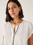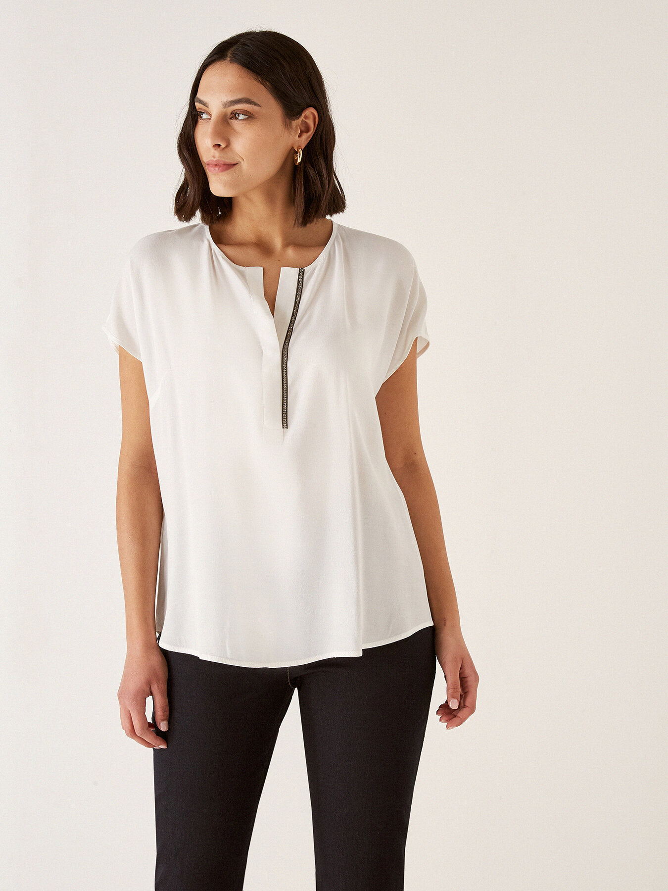 Blusa in marocaine di viscosa di linea diritta; fondo leggermente stondato; apertura verticale davanti con cristalli applicati.