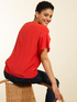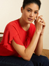 Blusa in tessuto crêpe marocaine di viscosa dalla linea diritta; scollo a barchetta con apertura a goccia e laccetto; spalla scesa chimonetta con manica corta a petalo.
