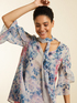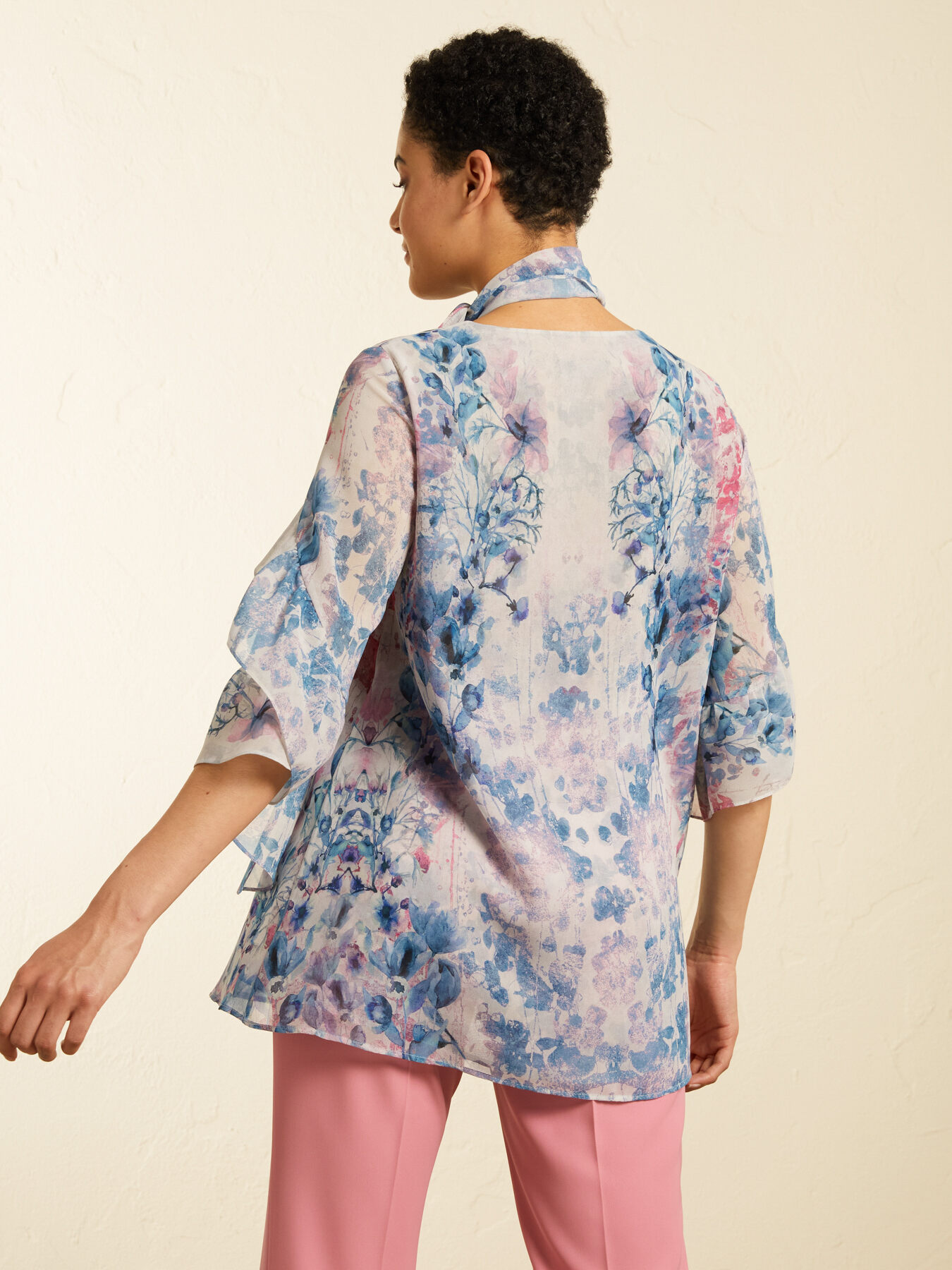 Blusa floreale in georgette, dalla linea svasata; scollo a "V" maniche a tre quarti e volant a petalo, fusciacca in tessuto; top unito alla scollatura.