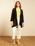 Cardigan in viscosa comfort dalla pregiata lavorazione a trafori; aperto davanti, con maniche lunghe; fusciacca nello stesso filato da infilare nei passanti e annodare a piacere.