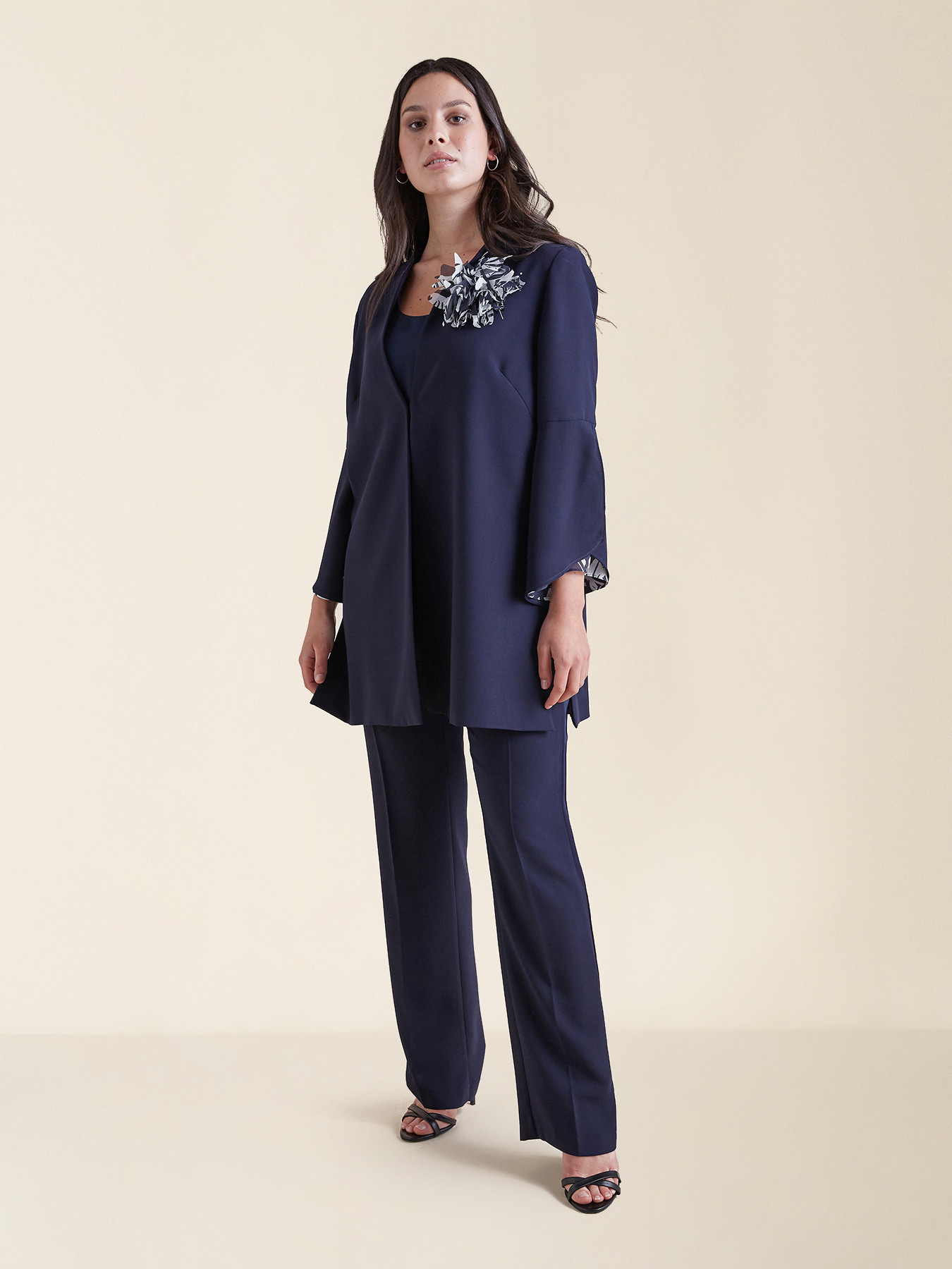 Giacca elegante in cady tinta unita; inserto interno nelle maniche e spilla in tessuto dalla stampa floreale; gancio per chiusura e scollo a V; spacchi al fondo.