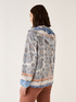 Giubbotto in tessuto tecnico stampato, con coulisse regolabile al fondo; collo coulissato con nastro in gros grain e cappuccio staccabile; tasche con zip, foderato in tessuto a rete.