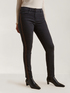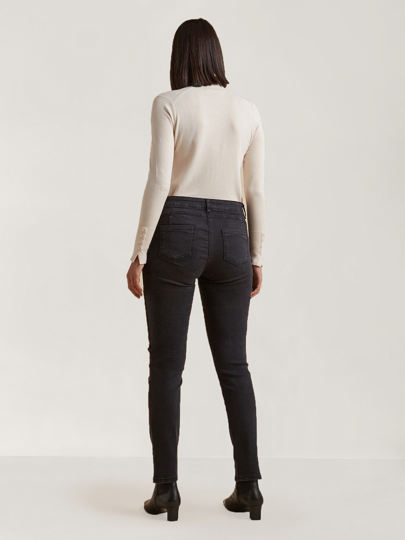 Jeans skinny con bordi in cristalli lungo le gambe; linea push up dietro; modello cinque tasche.