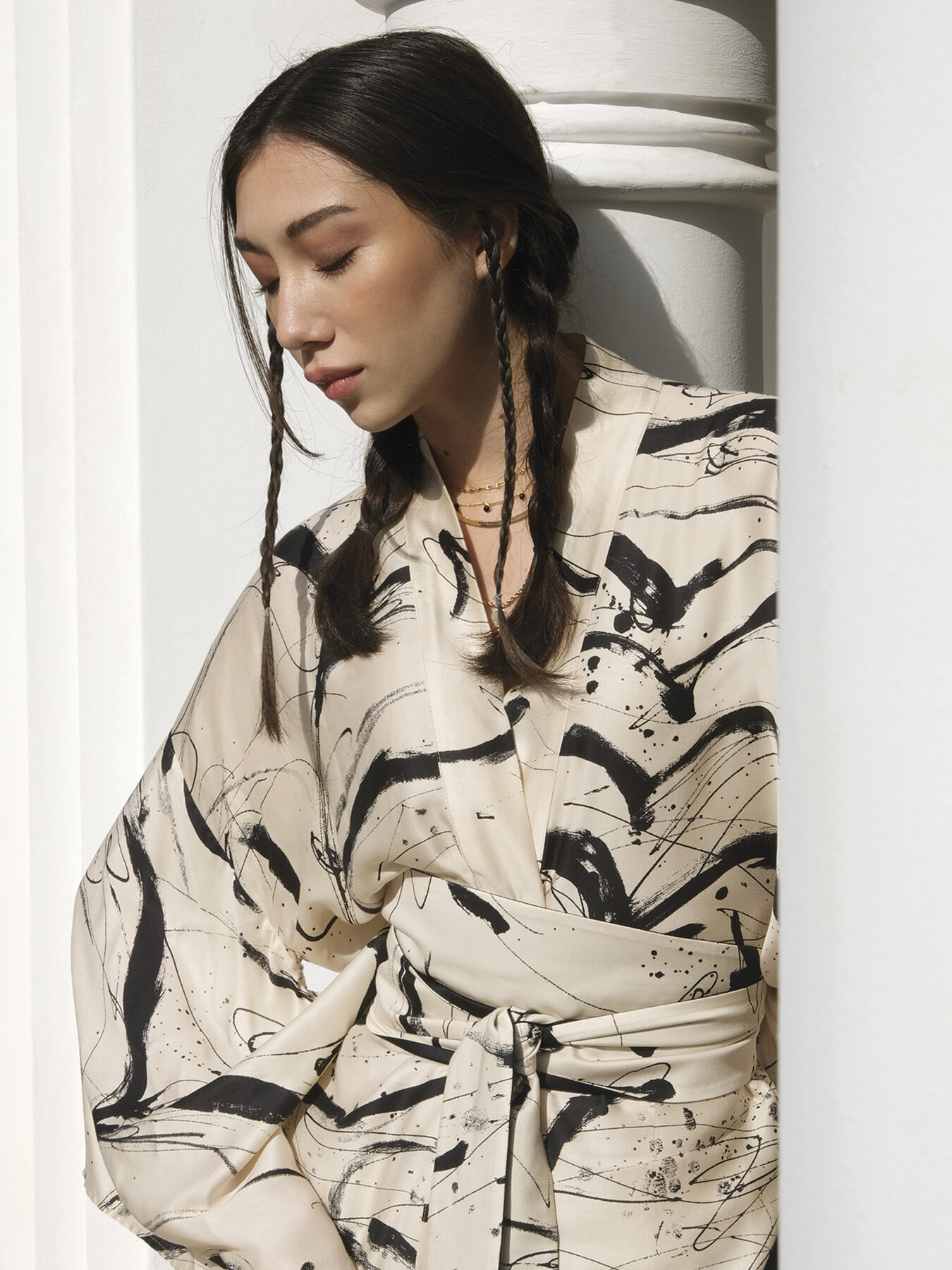 Kimono in viscosa stampata della collezione Lisa Von Tang per Elena Miro; aperto davanti, con bordi doppi di tessuto e cintura; maniche lunghe dal tipico taglio a kimono; lunghezza sotto i fianchi.