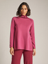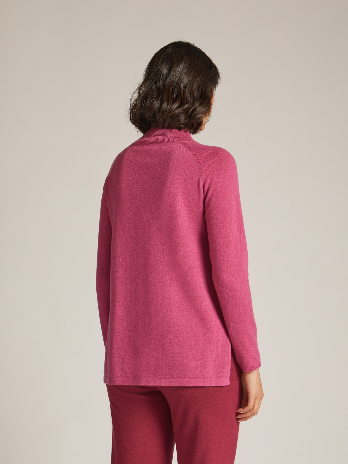 Maglia in extra fine wool dalla linea comfort; lavorazione in punto rasato, collo dolcevita, maniche raglan; applicazione di un bordo volant basso sulla sinistra; spacchi al fondo.
