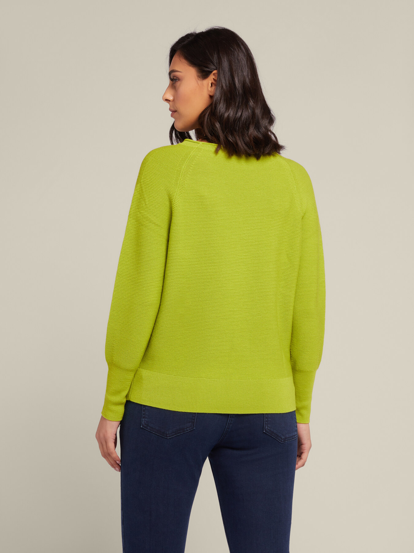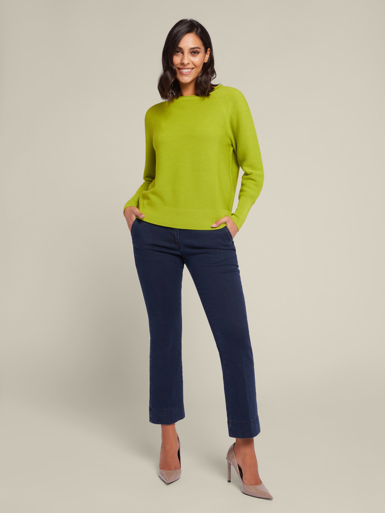 - Mini pull girocollo, in pura lana pettinata in punto links dall'effetto 3D, collo a coste leggermente montante.