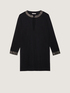 Maglia lunga con applicazioni in cristalli sul bordo scollatura e i polsi; apertura a goccia davanti da chiudere con bottone; linea dritta.