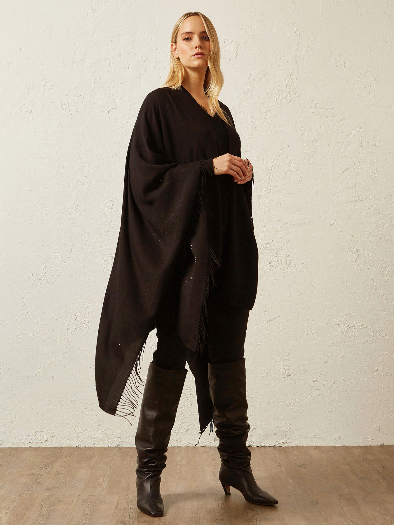 Mantella con frange al fondo; paillettes ricamate lungo i bordi; aperta davanti.
