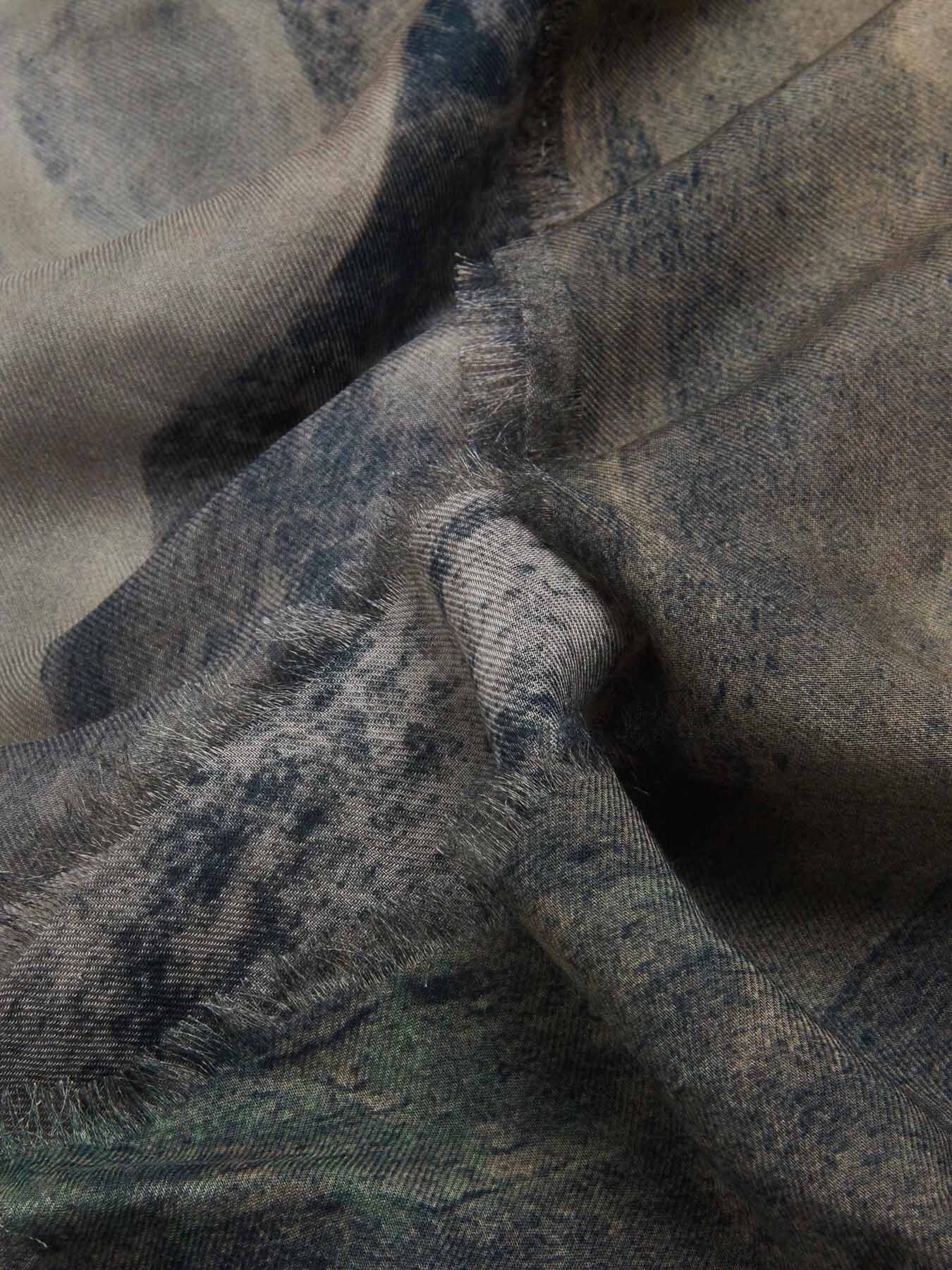 Maxi foulard di modal e cashmire con trattamento soft touch; stampa digitale ispirata da uno scatto fotografico di Kevin Zaouali; orlo sfrangiato, dimensioni 140x 140.