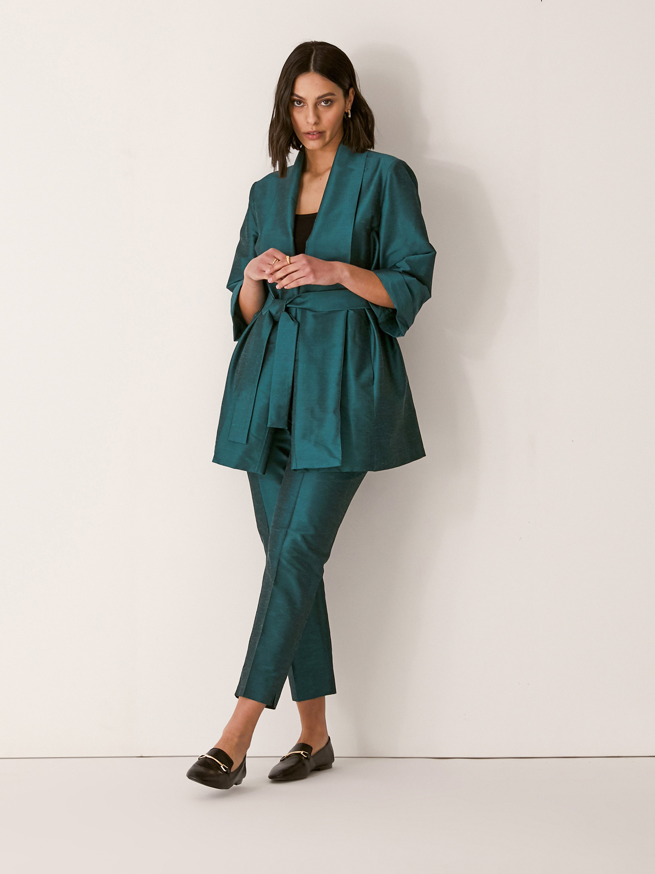 Pantaloni in shantung, di linea diritta slim, con lunghezza alla caviglia; chiusura davanti con zip nascosta e bottone; piega stirata