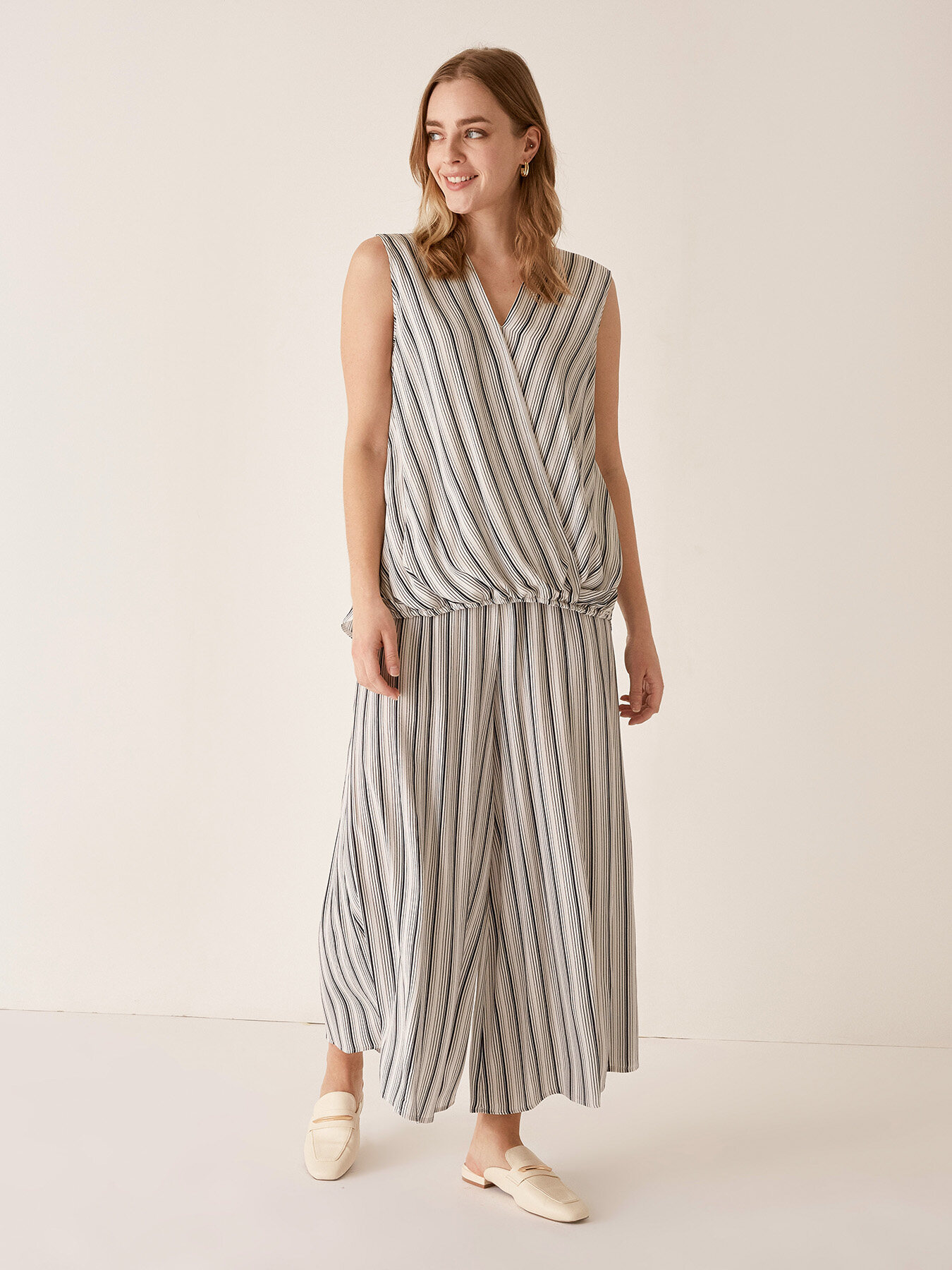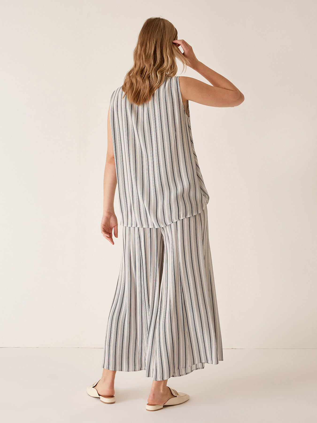 Pantaloni cropped rigati in marocaine di viscosa, linea svasata; lunghezza cropped; bordo in vita estensibile con filze elastiche che creano delle arricciature.