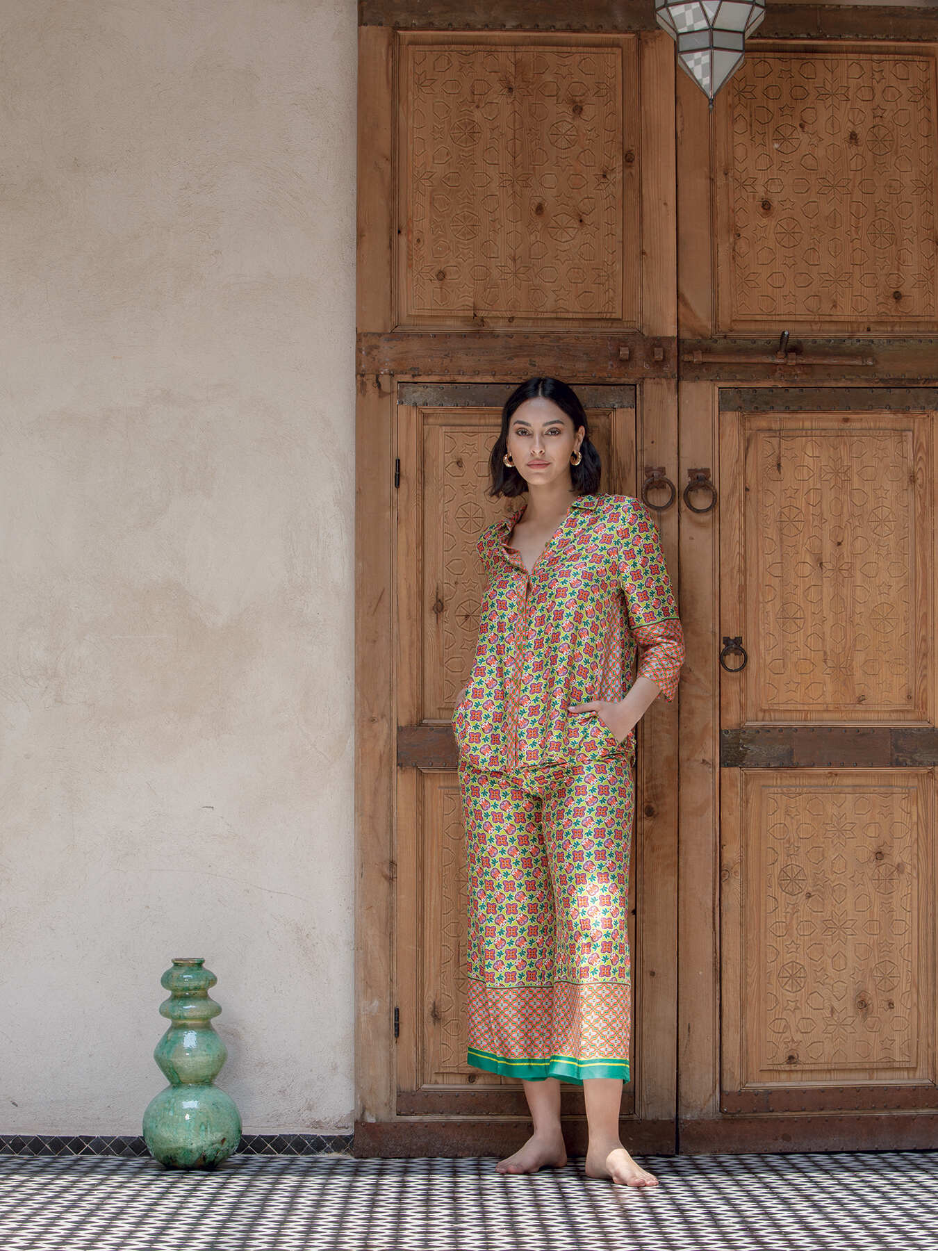 - Pantaloni dritti dalla stampa etnica, con bordo alto al fondo