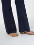 Pantaloni flare in tela di cotone; inserti orizzontali in pizzo al fondo; zip e bottone davanti, gamba svasata.
