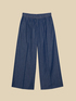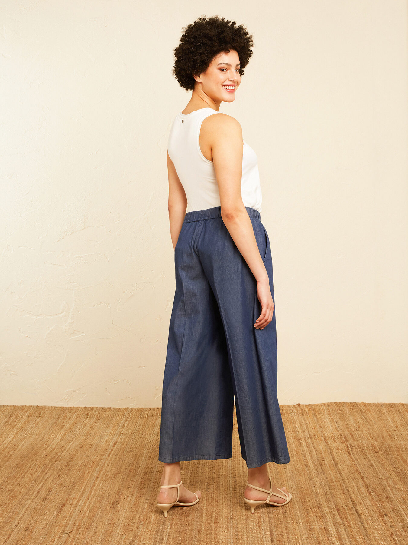 Pantaloni larghi in denim leggero; elastico interno in vita; tasche all'americana; lunghezza sopra alla caviglia.
