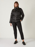 Piumino corto in nylon cangiante dalla linea affiancata e vestibilità aderente; collo in piedi, chiusura con zip doppio cursore, tasche zippate importanti, tiretti zip in nastro gros-grain; finissaggio antigoccia, imbottitura in vera piuma d'oca.