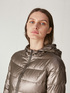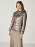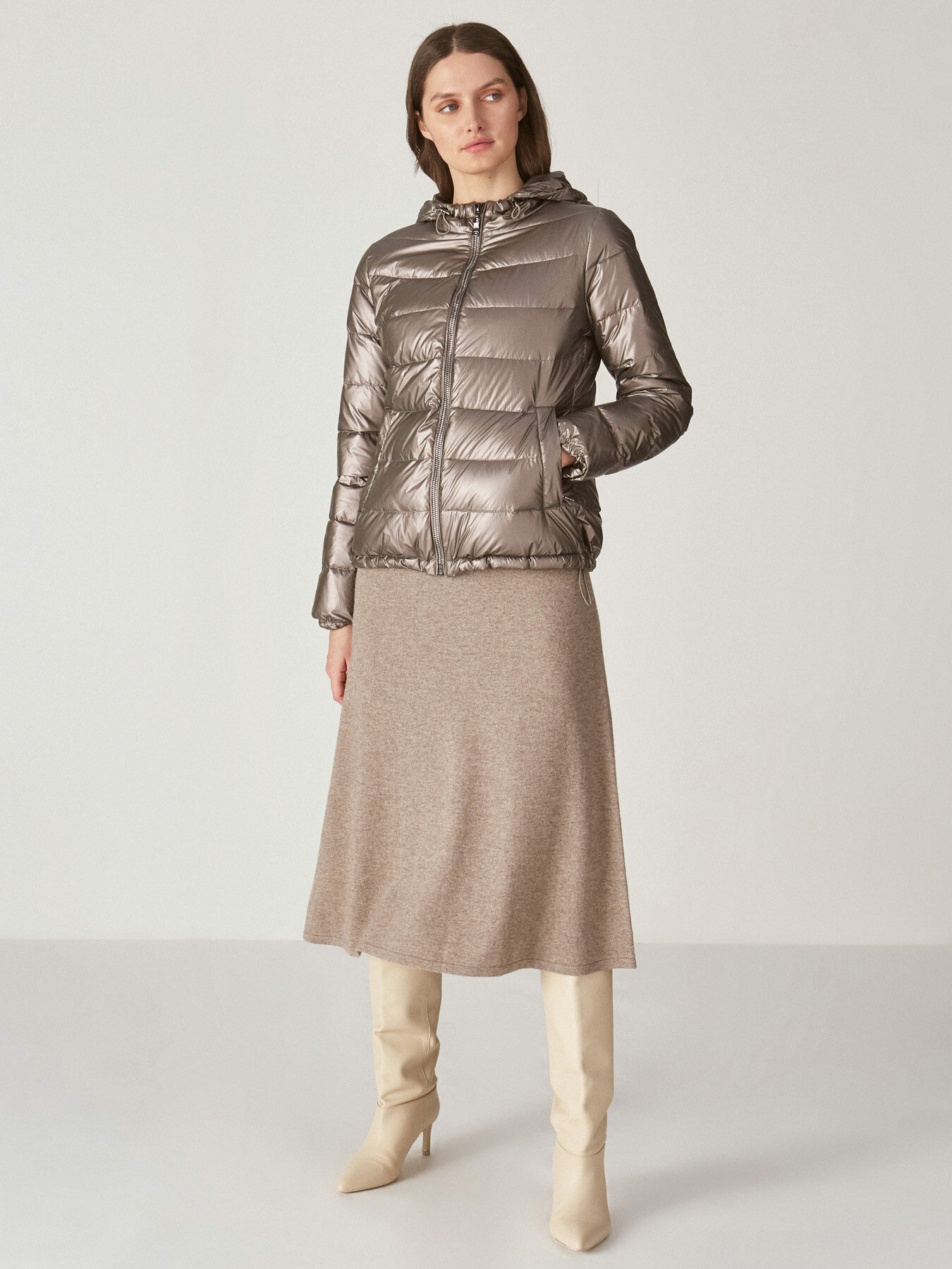 Piumino in nylon laminato dalla linea leggermente sciancrata; trapuntatura arcuata, cappuccio coulissato, chiusura con zip; fondo con coulisse interna regolabile, tasche a filetto con zip interna, imbottitura in vera piuma d'oca.