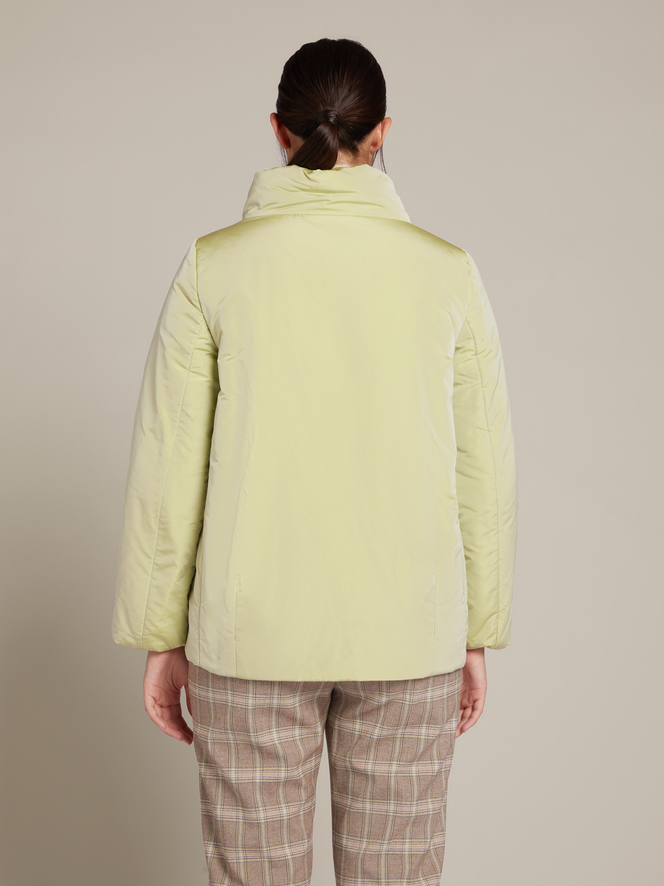 Scende a trapezio, ha ampio collo protettivo ed è in taffetà lucente color clorofilla con l’imbottitura in cashmere riciclato. Cashfeel, l’imbottitura morbida, calda e traspirante, realizzata dal recupero di filati di cashmere pregiati raccolti e selezionati in Italia. La sera, sfoggialo insieme ai toni chiari del latte e del mandorla: il mix è ultra chic.