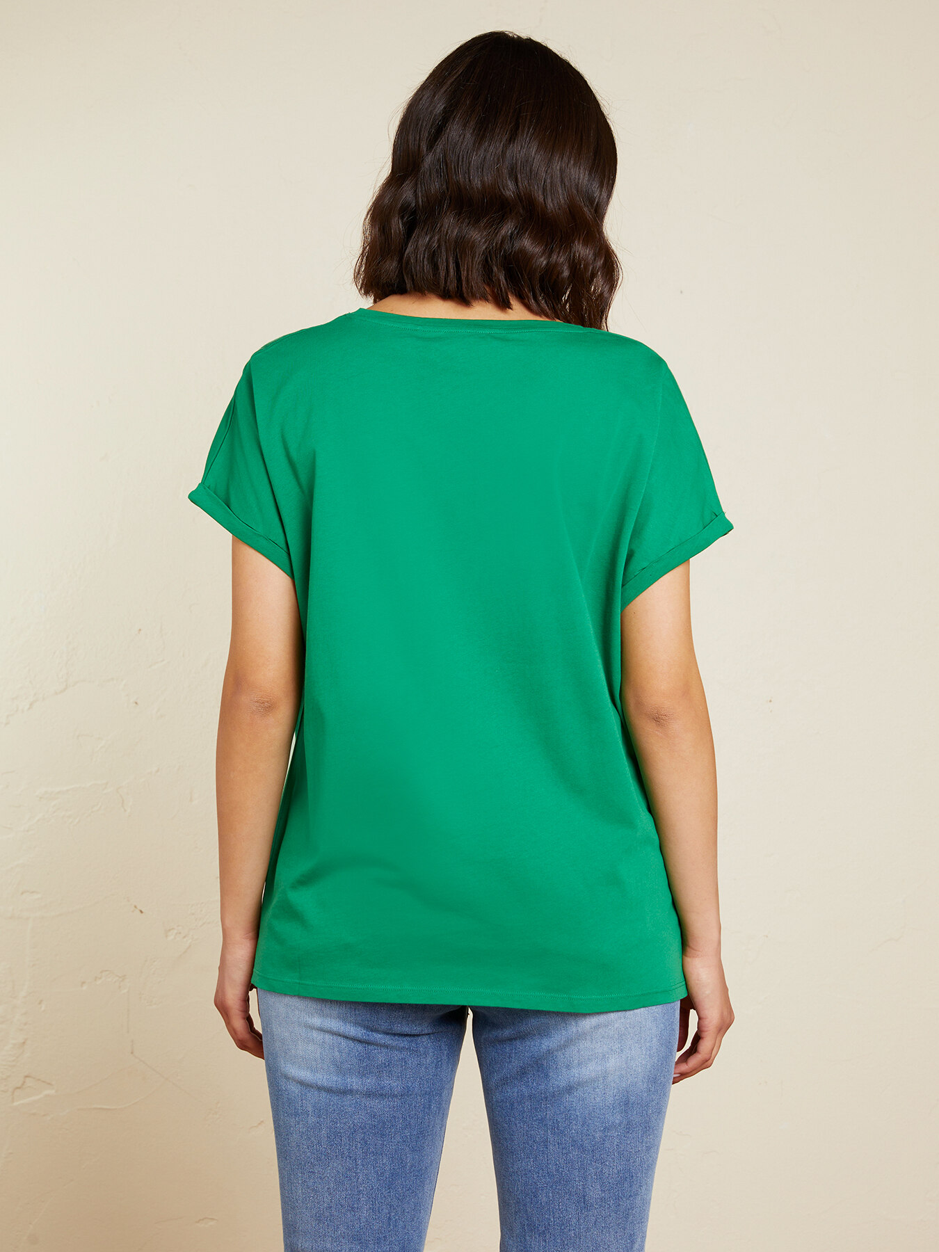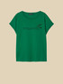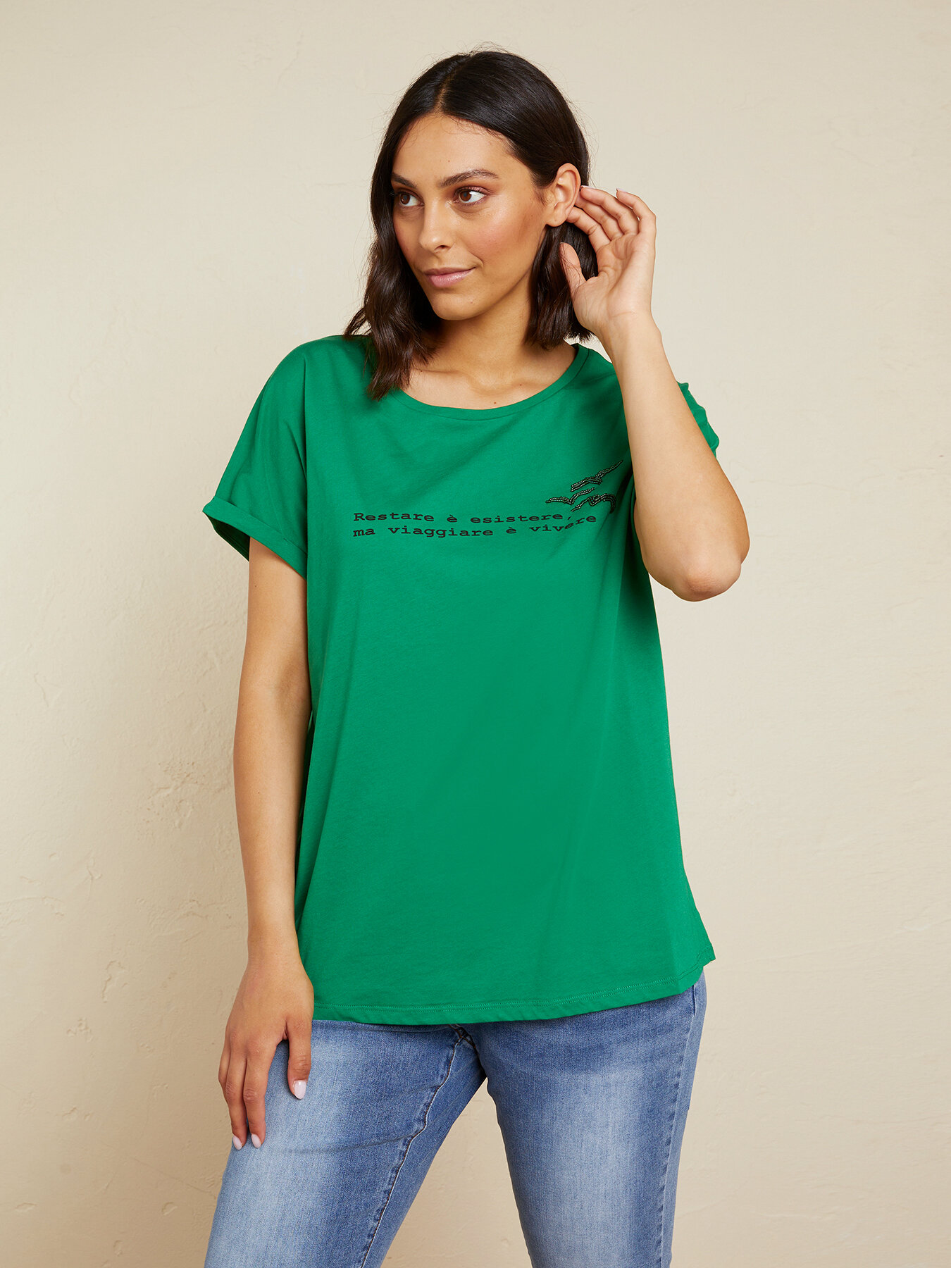 T-shirt con stampa ispirata al viaggio e a cio’ che ci lascia nel cuore; jersey di cotone ; scollo tondo e maniche corte con risvolto, ricamo in piccole perline.