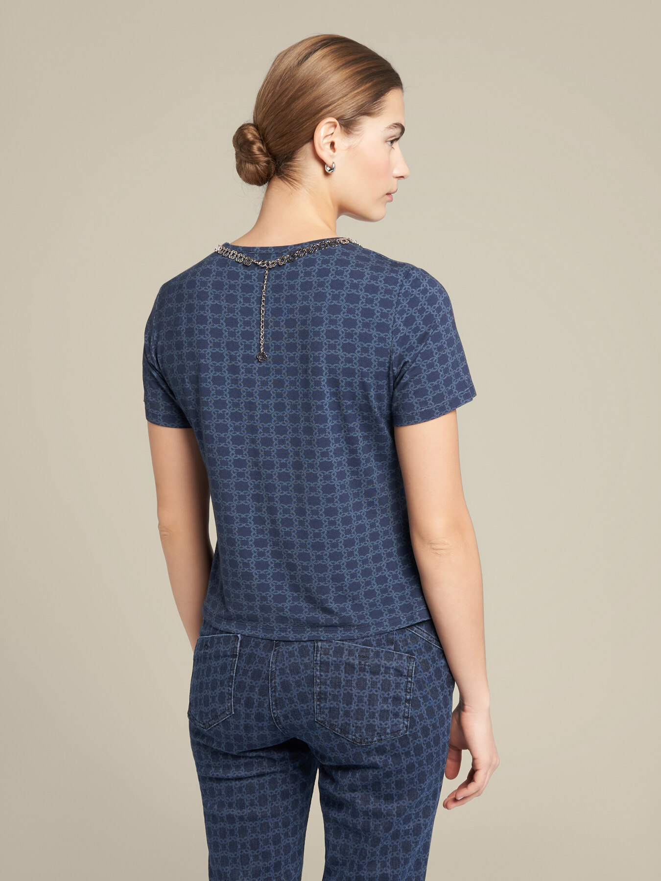 Come trasformare la T-shirt in un pezzo ultra versatile? La stampa la rende speciale di giorno; il décor metallico in cui il monogram diventa una collana removibile, ne fa il capo perfetto anche per la sera.