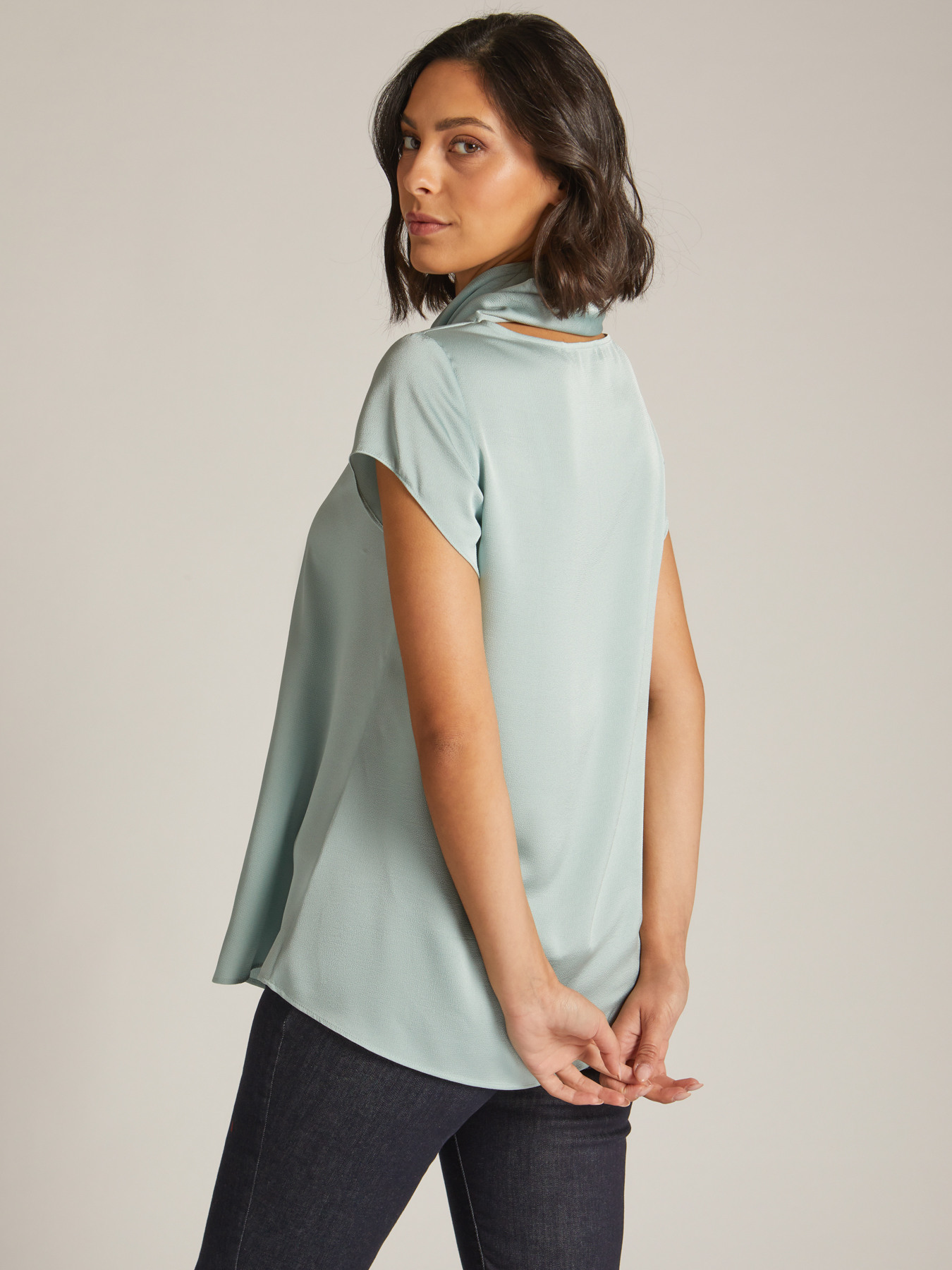 Top in raso; fusciacca da annodare al collo; manica corta.