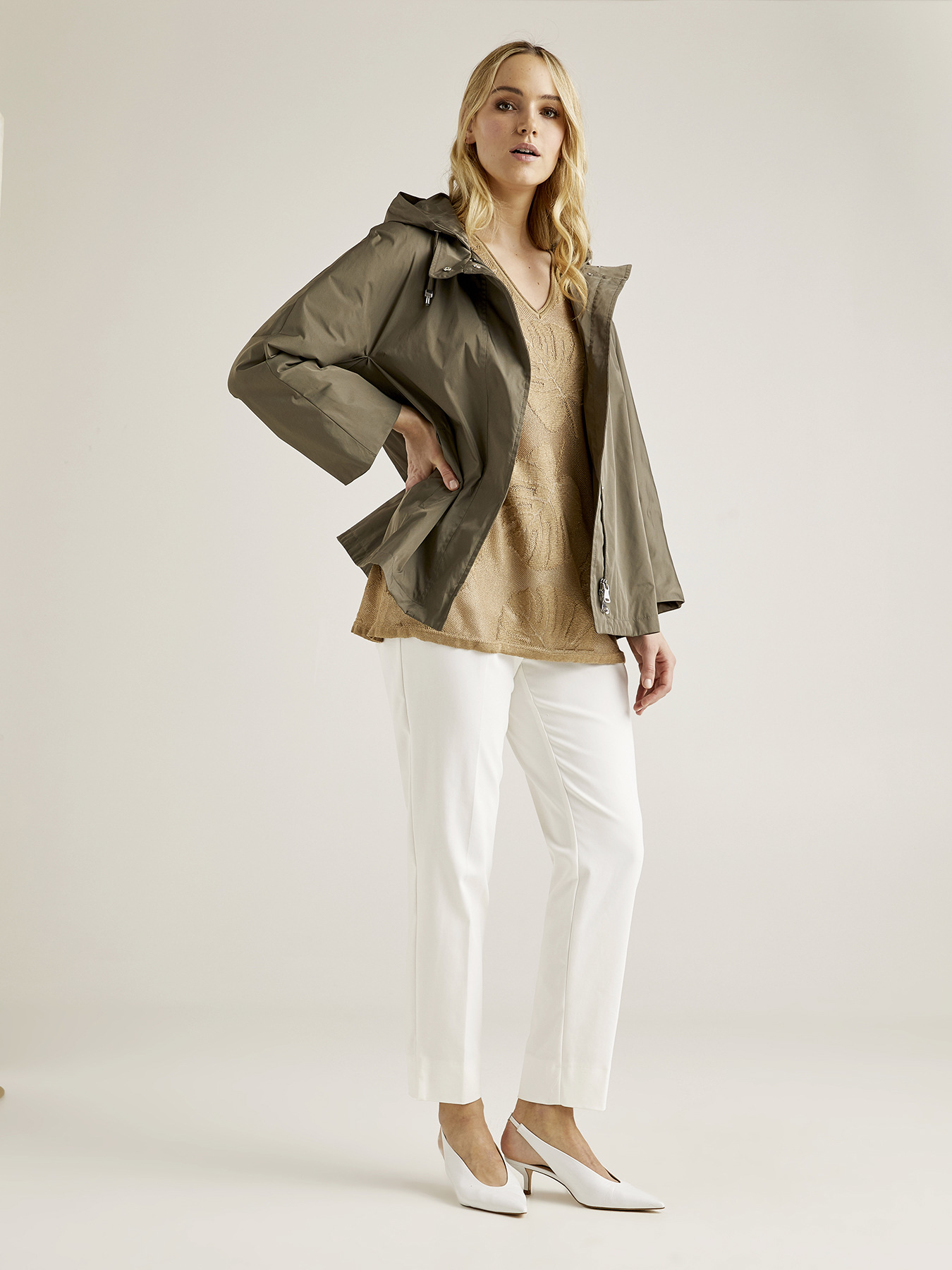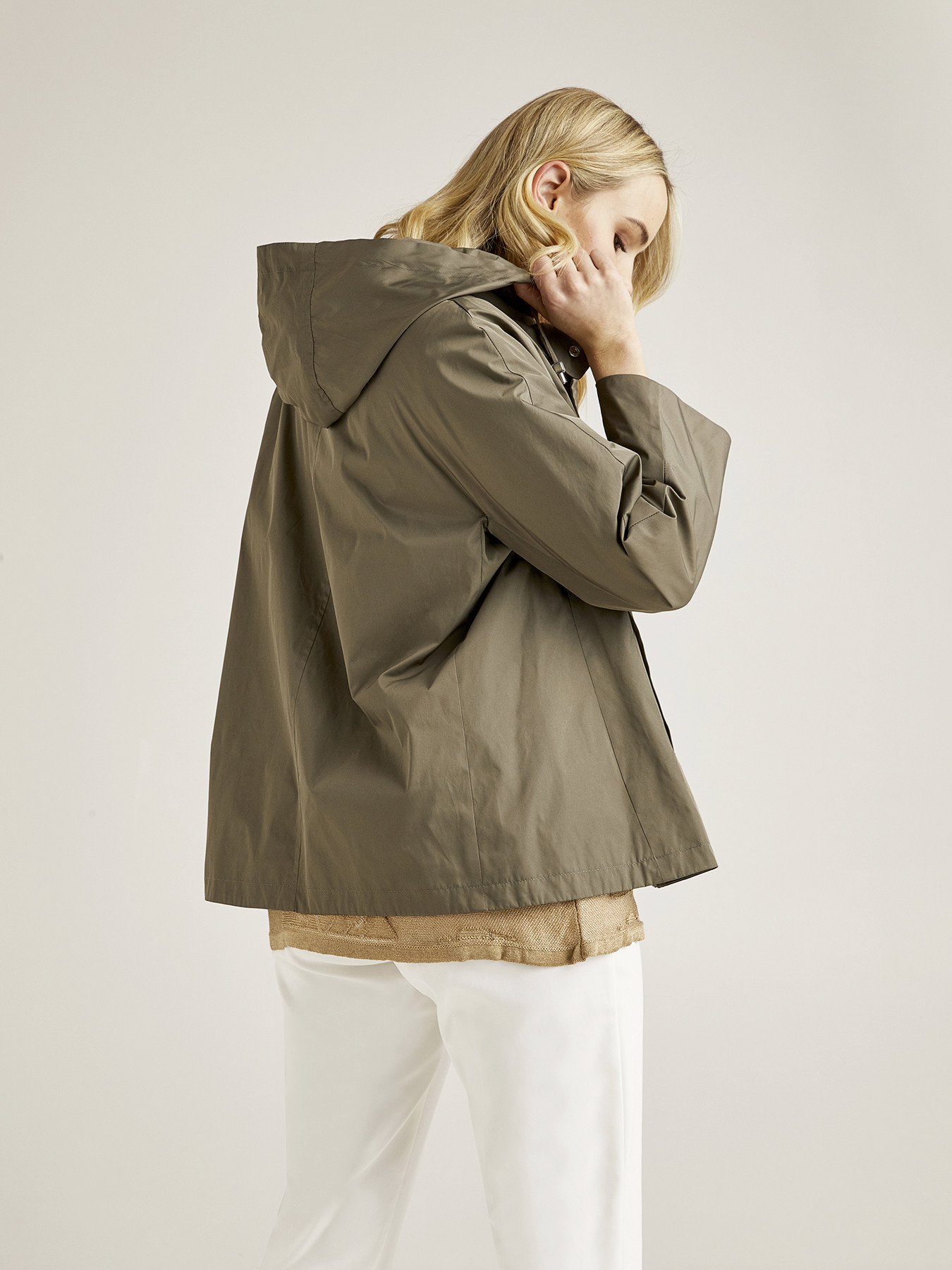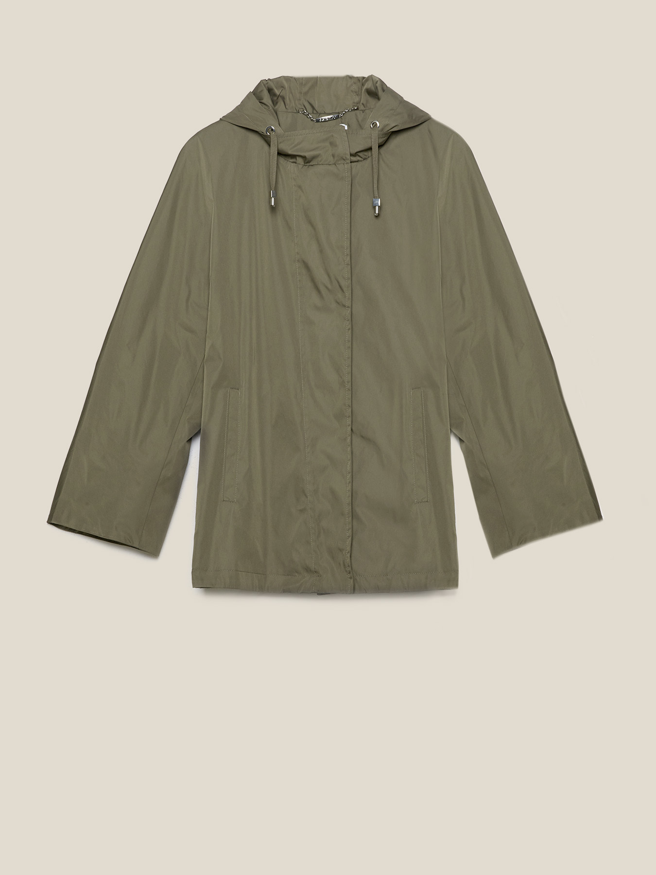 Blusão de nylon; capuz; modelagem em A; fecho de correr.
