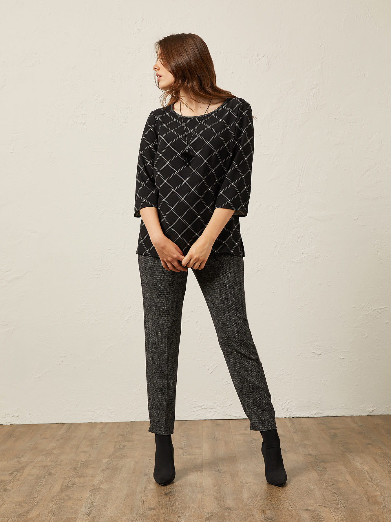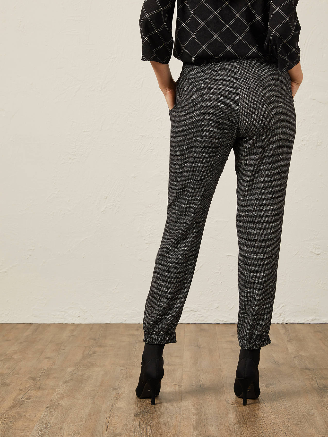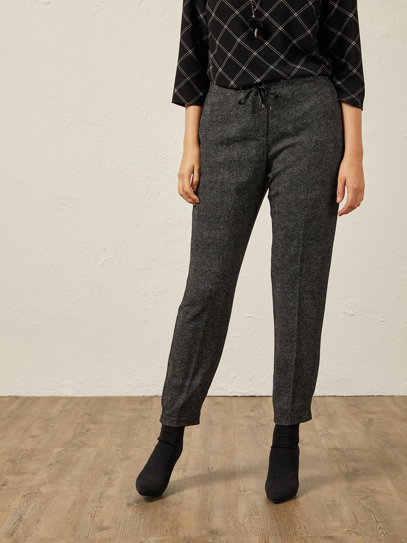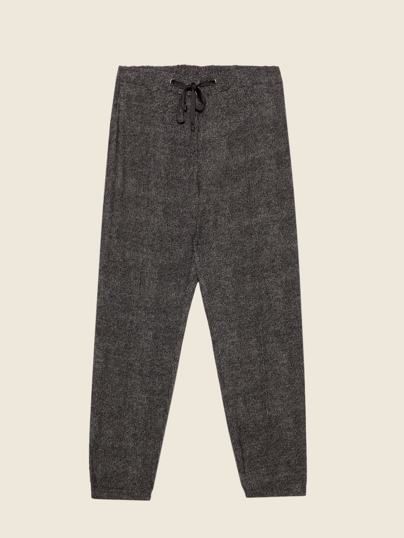 Detalhes do produto Calças joggers em tecido prestigioso fantasia; cordão na cintura; vinco; vira na parte inferior.