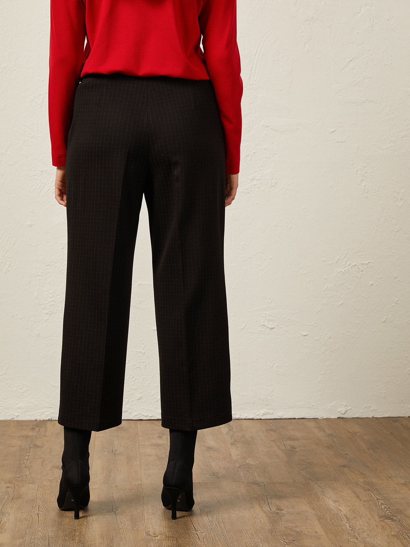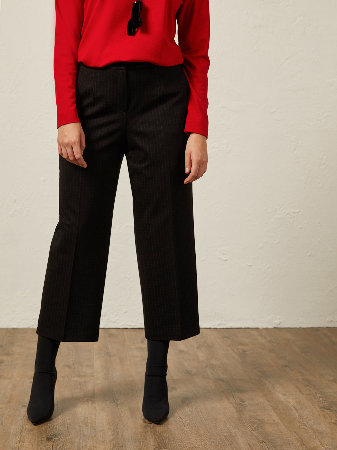 Calças retas em tecido prestigioso de fio tingido stretch; fecho de correr e botão à frente; vinco; comprimento acima do tornozelo.