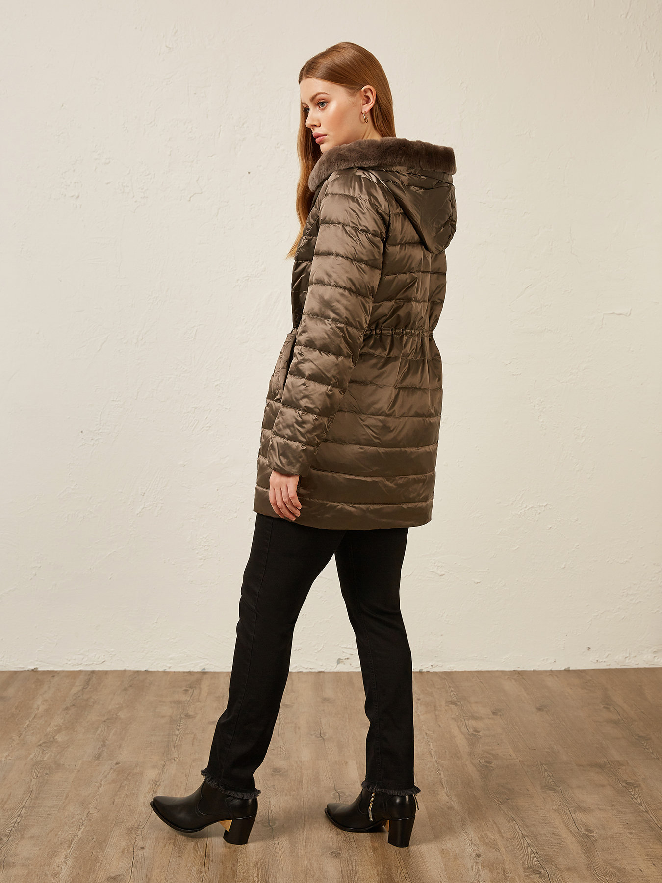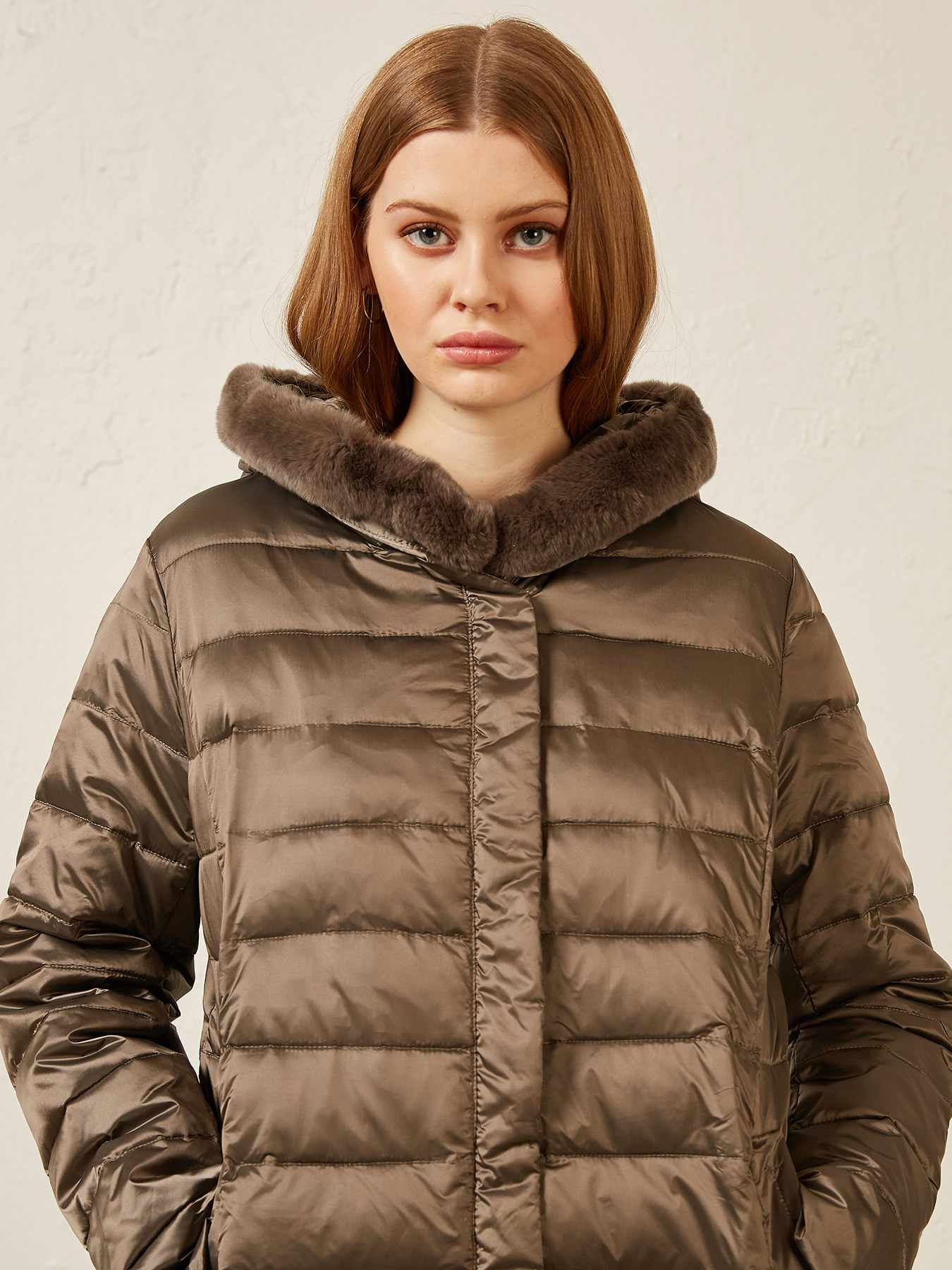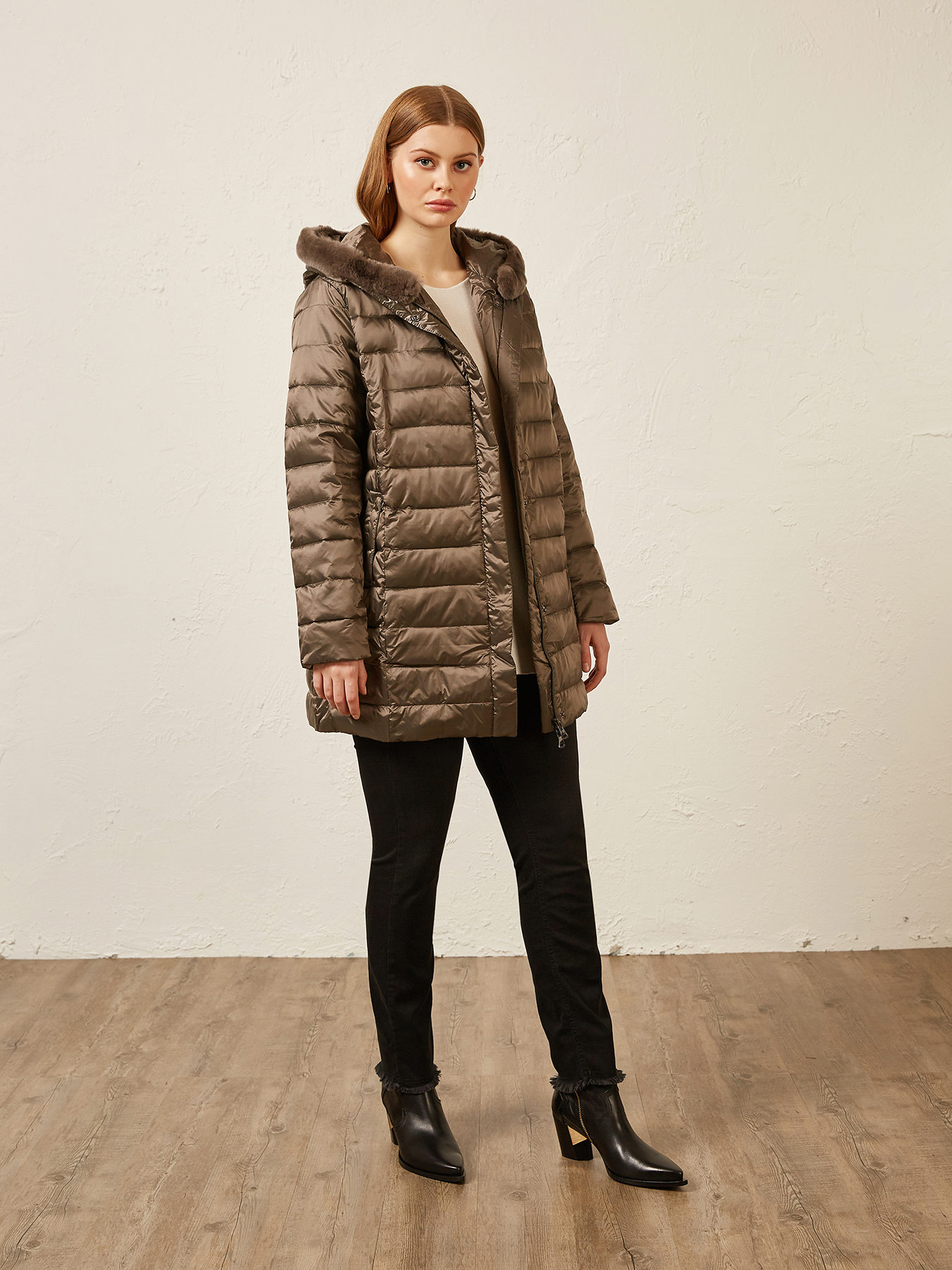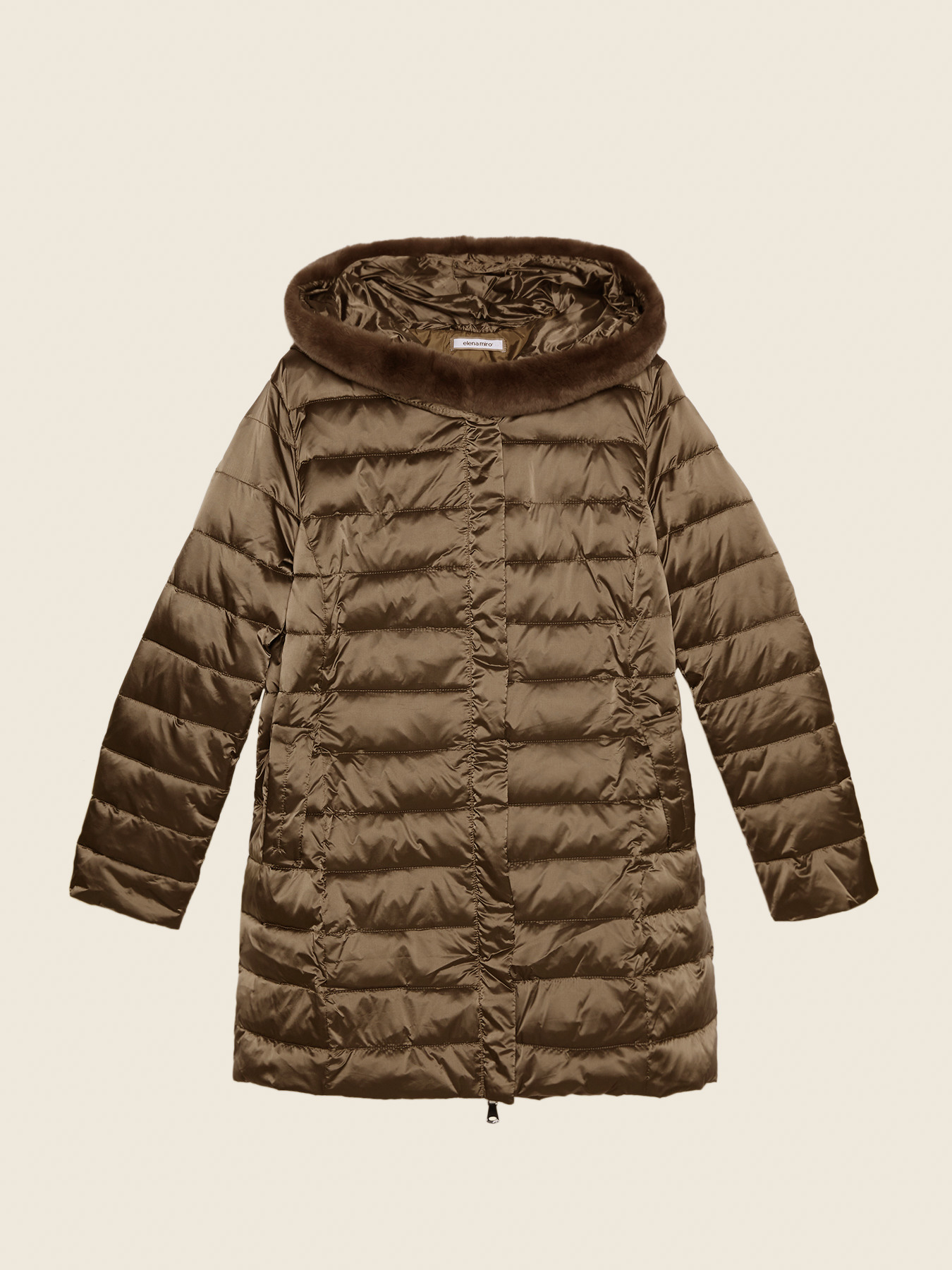 Casaco acolchoado em nylon furta-cor pespontado; fecho de correr e lapela com botões de pressão; capuz com borda de pelo de coelho destacável; enchimento em material prensado.