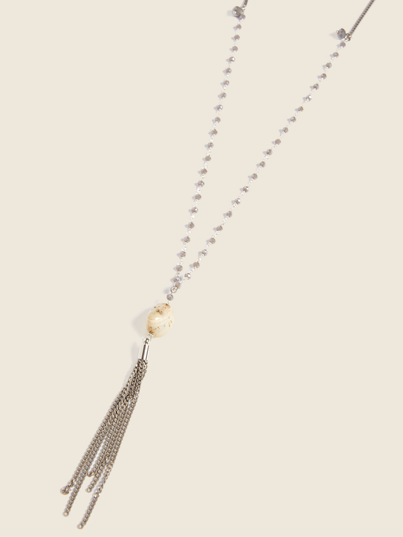 Detalhes do produto Colar longo com cristais facetados; pingente pendente; fecho de gancho.