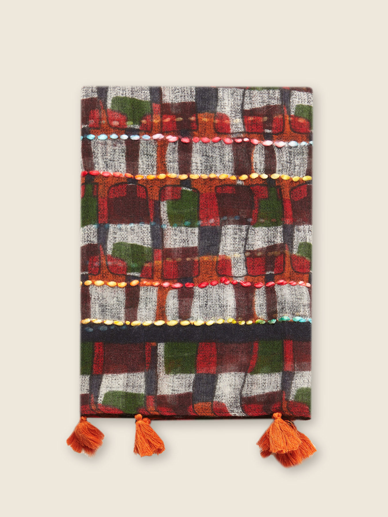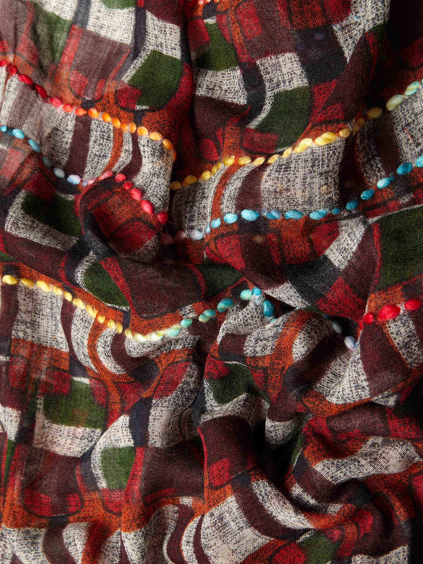 Echarpe em lã com estampa multicolorida; inserções de fio colorido ; borlas na parte inferior; 180X95 cm.