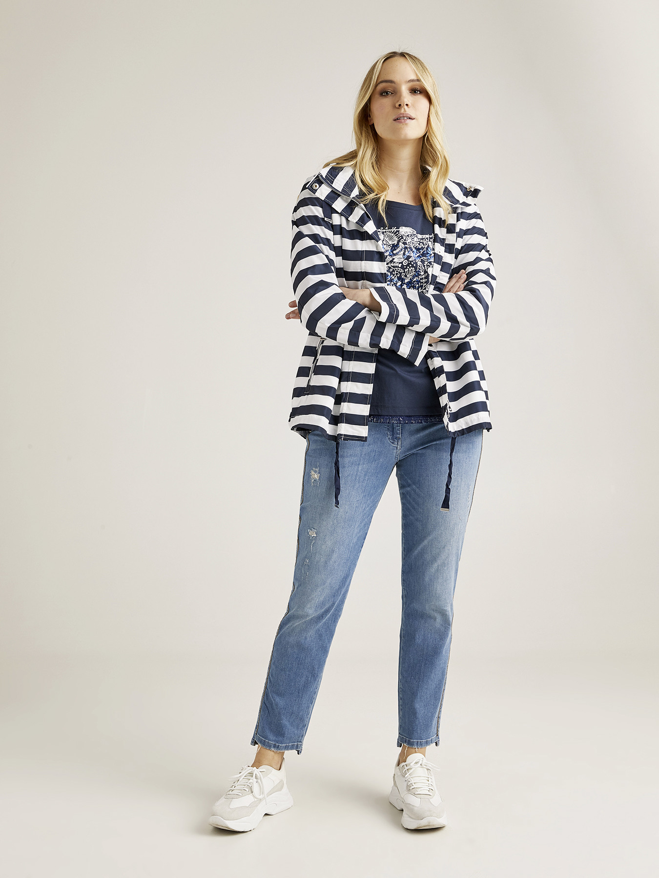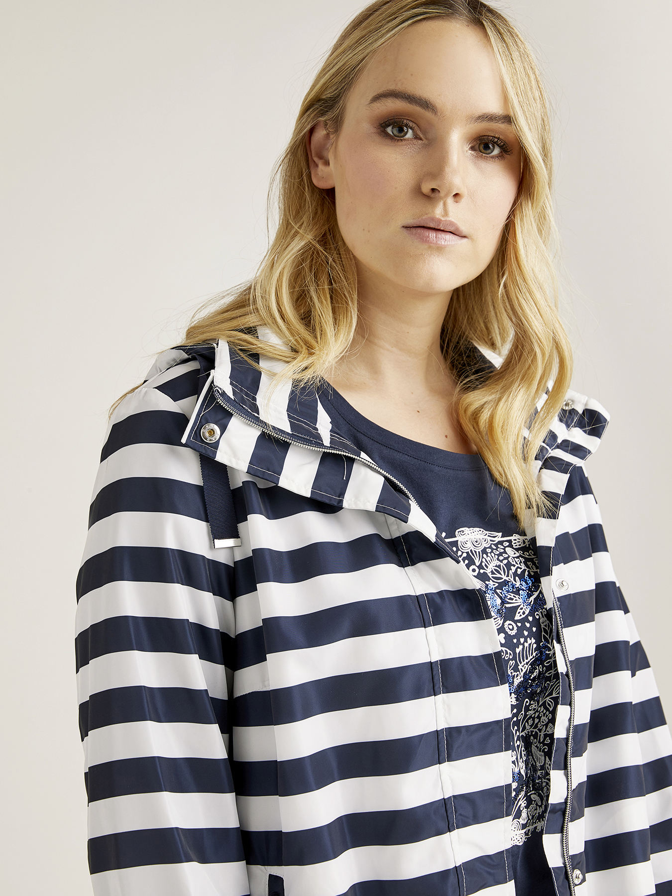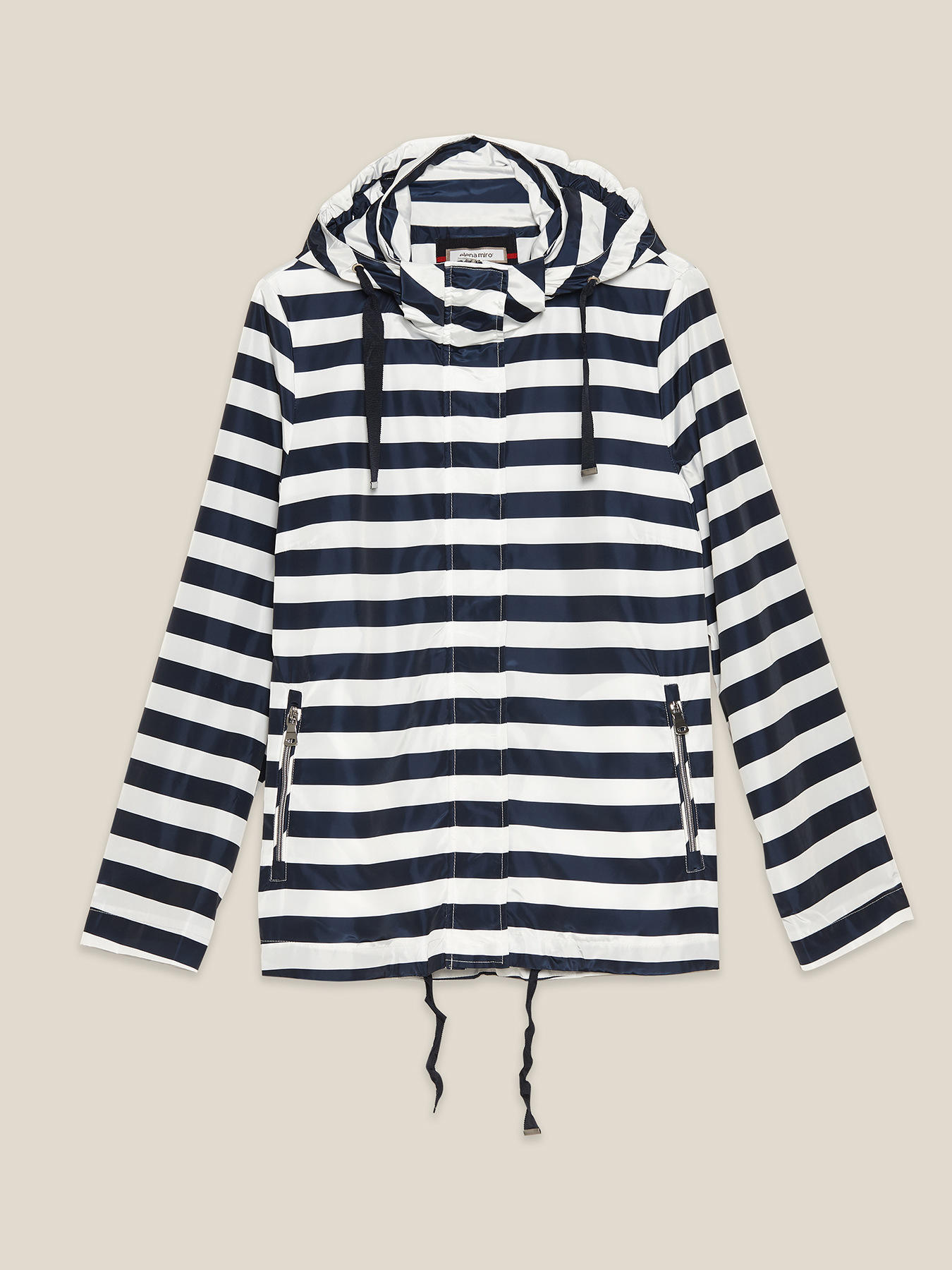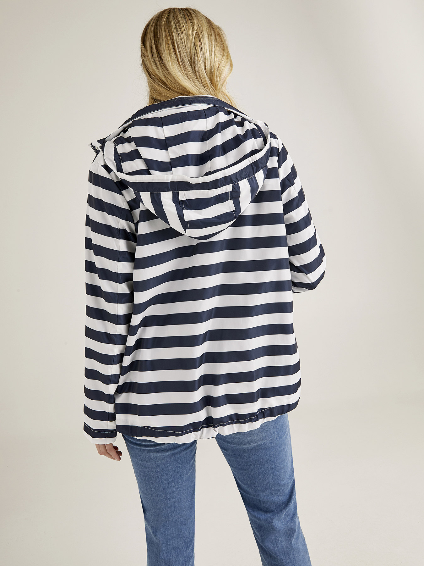 Giubbotto in nylon stampato a righe con zip per chiusura, cappuccio, fodera interna a righe; coulisse a fondo capo; linea blusante ad a; cappuccio staccabile