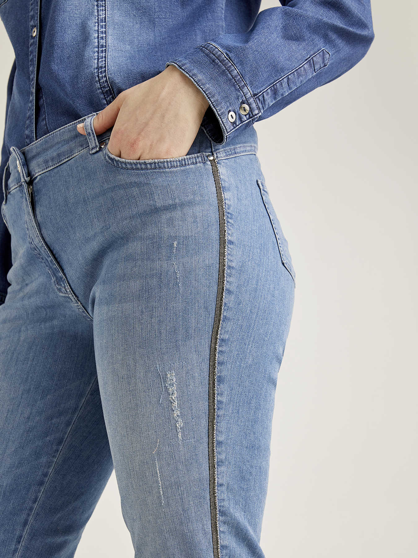 Jeans blu chiaro con perline ricamate lungo i lati e leggere lisature davanti; orlo sfrangiato; Linea push up dietro