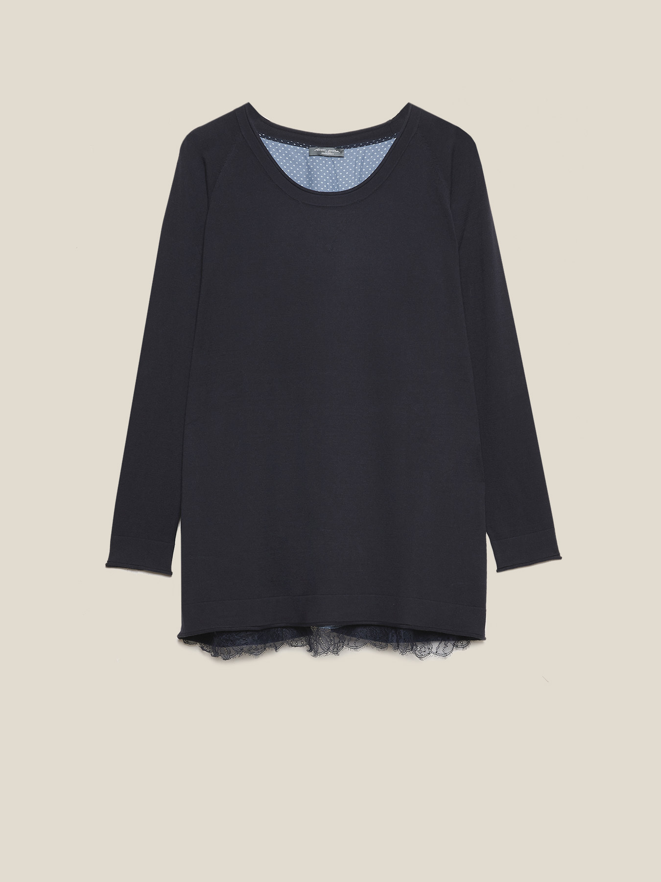 Maglia con inserto dietro in tessuto stampato e parti in tricot da fermare con due nastri in gros grain; bordo in pizzo al fondo; Scollo tondo e linea svasata