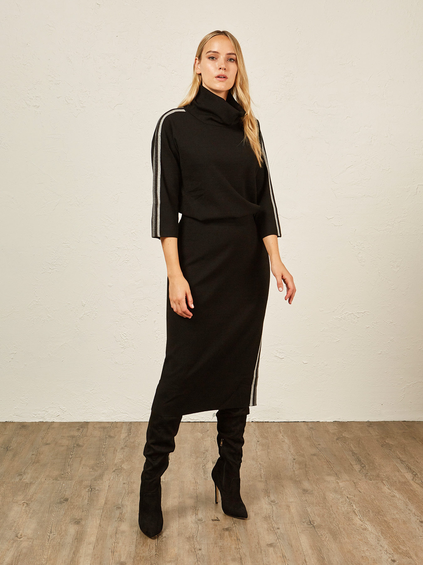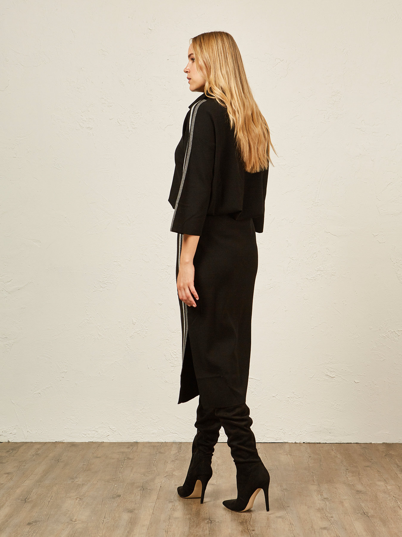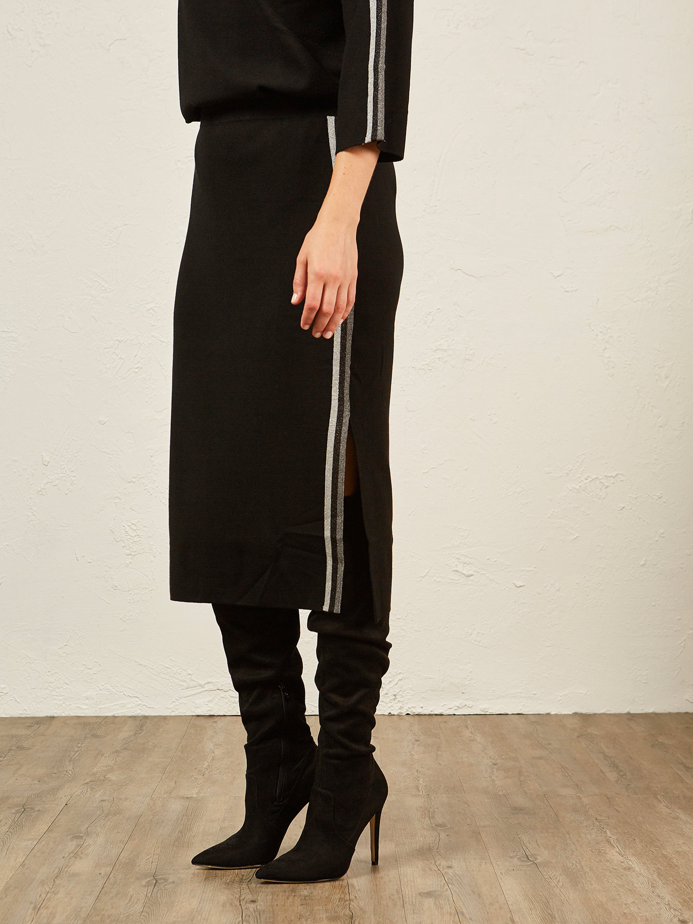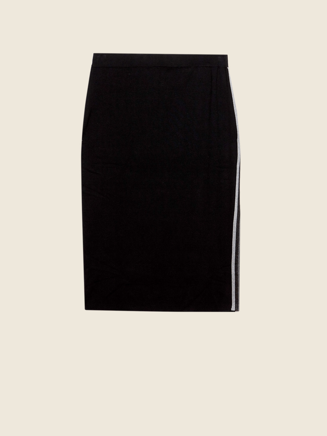 Saia de malha; borda lateral na perna direita; fenda na perna direita; elástico na cintura.
