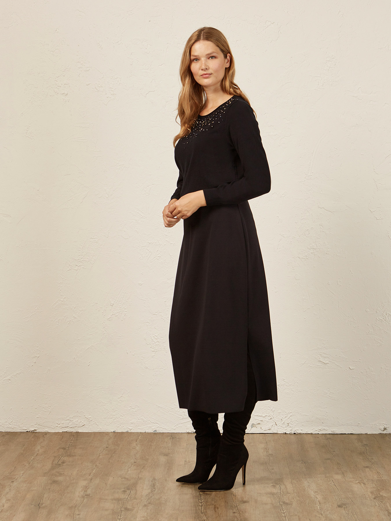 Sweater com cristais bordados na frente; mangas compridas; decote canoa; modelagem reta.