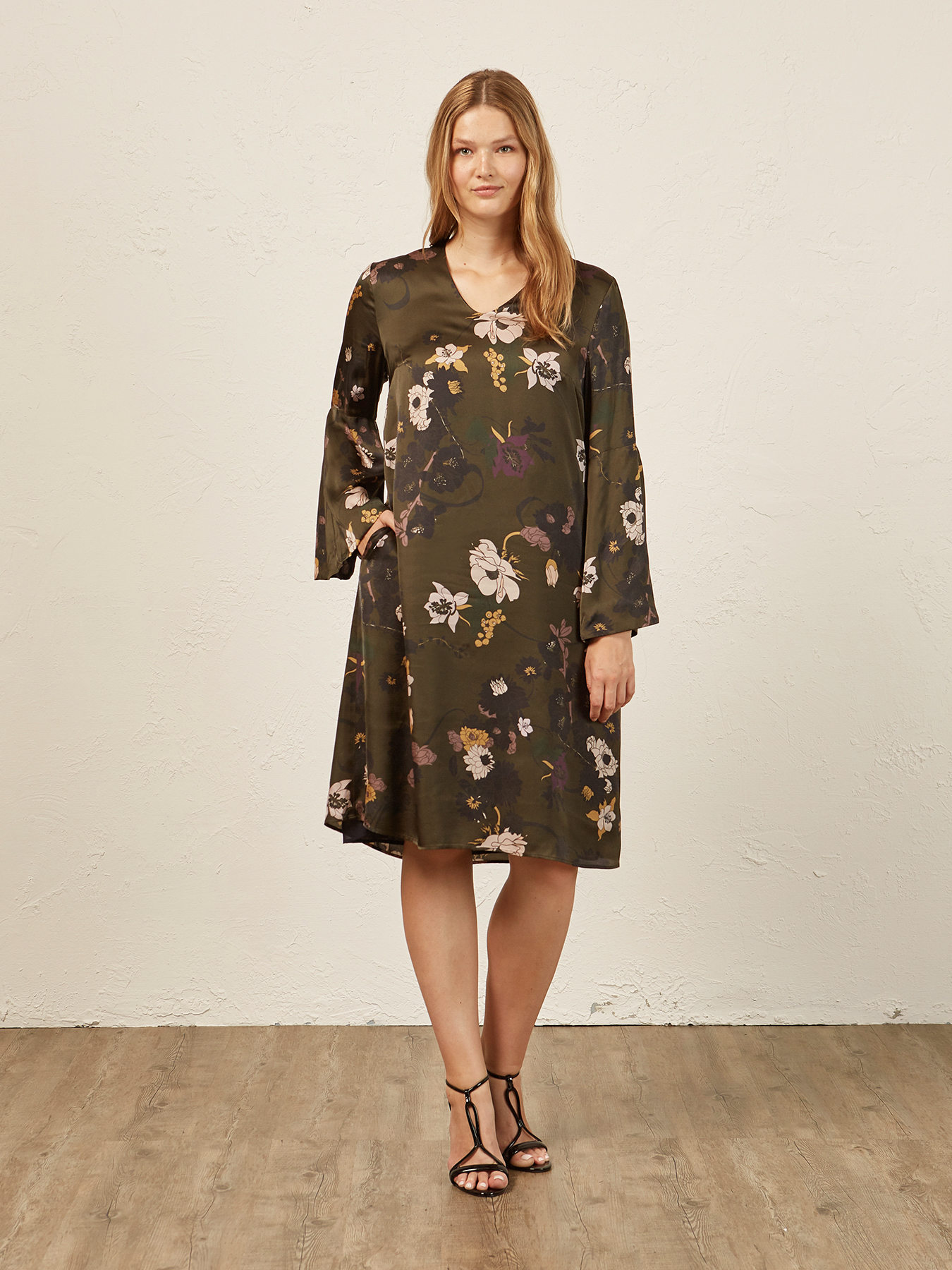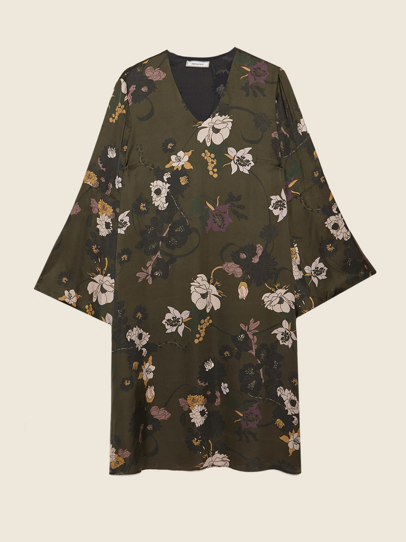 Vestido longo em cetim estampado floral; mangas com linha evasé, com fenda; dois bolsos e decote em V.